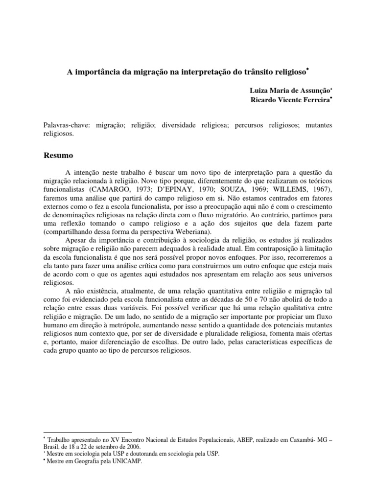 A importância da migração na interpretação do trânsito religioso ∗