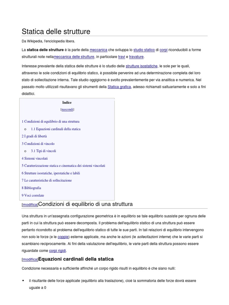 4 Sistemi vincolati 5 Caratterizzazione statica e cinematica dei sistemi vincolati 6 Strutture isostatiche, iperstatiche e labili 7 Le caratteristiche di sollecitazione 8 Bibliografia 9 Voci correlate