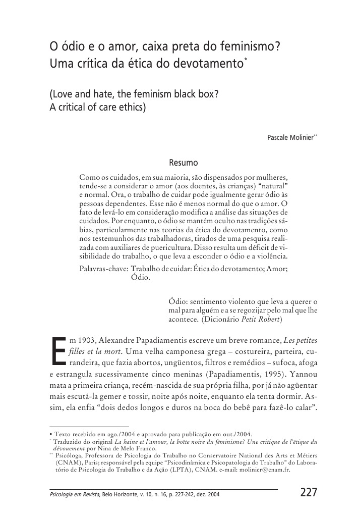 * Traduzido do original La haine et l’amour, la boîte noire du féminisme? Une critique de l’étique du dévouement por Nina de Melo Franco. ** Psicóloga, Professora de Psicologia do Trabalho no Conservatoire National des Arts et Métiers (CNAM), Paris; responsável pela equipe “Psicodinâmica e Psicopatologia do Trabalho” do Labora- tório de Psicologia do Trabalho e da Ação (LPTA), CNAM. e-mail: molinier@cnam.fr.