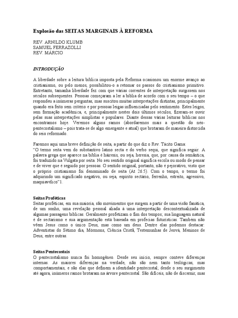 REV. ARNILDO KLUMB SAMUEL FERRAZOLLI REV. MRCIO INTRODUO A liberdade sobre a leitura bblica imposta pela Reforma ocasionou um enorme avano ao cristianismo, ou pelo menos, possibilitou-o a retomar os passos do cristianismo primitivo. Entretanto, tamanha liberdade fez com que vrias correntes de interpretao surgissem nos sculos subsequentes. Pessoas comearam a ler a bblia de acordo com o seu tempo o que respondeu a inmeras perguntas, mas suscitou muitas interpretaes distintas, principalmente quando era feito sem critrio e por pessoas leigas influenciadas pelo sentimento. Estes leigos, sem formao acadmica, e, principalmente nestes dois ltimos sculos, fizeram-se ouvir pelas suas interpretaes simplistas e populares. Diante dessas vrias leituras bblicas nos encontramos hoje. Veremos alguns ramos (abordaremos mais a questo do nopentecostalismo pois trata-se de algo emergente e atual) que brotaram de maneira distorcida do seio reformado. Faremos aqui uma breve definio de seita, a partir do que diz o Rev. Tcito Gama: O termo seita vem do substantivo latino secta e do verbo sequi, que significa seguir. A palavra grega que aparece na bblia hiresis, ou seja, heresia, que, por causa da semntica, foi traduzido na Vulgata por seita. No seu sentido original significa escola ou modo de pensar e de viver que seguido por pessoas. O sentido original, portanto, no pejorativo, visto que o prprio cristianismo foi denominado de seita (At 26.5). Com o tempo, o termo foi adquirindo um significado negativo, ou seja, esprito sectrio, ferrenho, estreito, agressivo, maquiavlico1. Seitas Profticas Seitas profticas, em sua maioria, so movimentos que surgem a partir de uma viso fantica, de um sonho, uma revelao pessoal aliada uma interpretao descontextualizada de algumas passagens bblicas. Geralmente profetizam o fim dos tempos; sua linguagem natural de sectarismo e sua argumentao est baseada em profecias futursticas. Tambm no vem Jesus como o nico Deus, mas como um deus. Dentre elas podemos destacar: Adventistas do Stimo dia, Mrmons, Cincia Crist, Testemunhas de Jeov, Meninos de Deus, entre outras. Seitas Pentecostais O pentecostalismo nunca foi homogneo. Desde seu incio, sempre conteve diferenas internas. As maiores diferenas na verdade, no so nem tanto teolgicas, mas comportamentais, e so elas que definem a identidade pentecostal; desde o seu surgimento at agora, inmeros ramos brotaram na rvore pentecostal. So difceis, no de discernir, mas