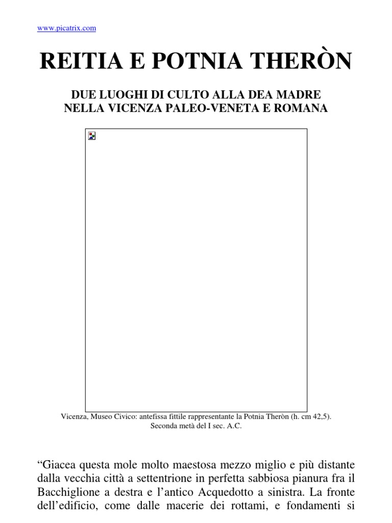 Simone sosteneva di avere invocato lanima di un ragazzo innocente che era stato assassinato, e di avergli ingiunto di entrare in un nuovo corpo, che egli stesso aveva plasmato con laria, formando cos un nuovo essere umano. Definiva questa, essere unimpresa molto pi grandiosa della creazione di Adamo da parte di Dio padre, . . . poiche Egli cre un uomo con la terra, io invece con laria, una creazione molto pi difficile. Questa creatura era chiamata homunculus. Nella visione della simpatia cosmica, il cielo e la terra assomigliano ad una matrice, con lomphalos al centro; per immaginare la forma si pensi ad una matrice piena: tali sono il cielo, la terra e la regione intermedia. In questa strana visione il cordone collega il cielo, che il feto, alla terra che ne la placenta. Il disegno di via Giacosa, che la foto aerea ha rilevato, dunque un luogomagico, dove il potere della generazione terrestre mette in atto le sue alchimie. Avendo i Romani costruito accanto ad esso un tempio dedicato alla Potnia Thern, possibile supporre che alla Dea madre fosse sacro anche il precedente luogo di culto e che, per quelle precise caratteristiche, appartenesse alla dea dei Veneti, Reitia. Strabone riferisce di unArtemide-Potnia Thern che regna in un bosco sacro nei pressi del Timavo, nella terra dei Veneti. L intorno si dice.. le belve erano domestiche, cervi e lupi convivevano in pace, e si lasciavano accarezzare dagli uomini.. Un disco di bronzo rinvenuto a Montebelluna, una delle poche rappresentazioni della Dea in ambito venetico, in qualit di Reitia (fig.3).
