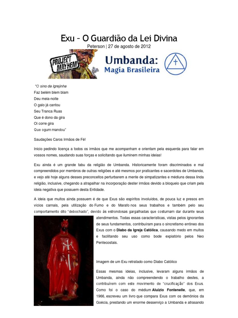 O sino da Igrejinha Faz belm blem blam Deu meia-noite O galo j cantou Seu Tranca Ruas Que dono da gira Oi corre gira Que ogum mandou Saudaes Caros Irmos de F! Inicio pedindo licena a todos os irmos que me acompanham e orientam pela esquerda para falar em vossos nomes, saudando suas foras e solicitando que iluminem minhas ideias! Exu ainda um grande tabu da religio de Umbanda. Historicamente foram discriminados e mal compreendidos por membros de outras religies e at mesmos por praticantes e sacerdotes de Umbanda, e vejo at hoje alguns desses preconceitos perturbarem a mente de simpatizantes e mdiuns dessa linda religio, inclusive, chegando a atrapalhar na incorporao dester irmos devido a bloqueio que criam pela ideia negativa que possuem desta Entidade. A ideia que muitos ainda possuem de que Exus so espritos involudos, de pouca luz e presos em vcios carnais, pela utilizao do Fumo e do Marafo nos seus trabalhos e tambm pelo seu comportamento dito debochado, devido s estrondosas gargalhadas que costumam dar durante seus atendimentos. Todas essas caractersticas, vistas pelos ignorantes de seus fundamentos, contriburam para o sincretismo errneo dos Exus com o Diabo da Igreja Catlica, causando medo em muitos e facilitando seu uso como bode expiatrio pelos Neo