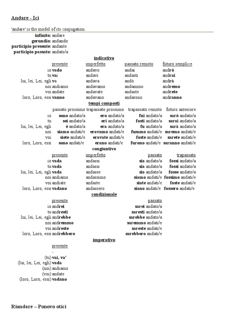 'andare' is the model of its conjugation. infinito: andare gerundio: andando participio presente: andante participio passato: andato/a indicativo presente imperfetto passato remoto futuro semplice io vado andavo andai andr tu vai andavi andasti andrai lui, lei, Lei, egli va andava and andr noi andiamo andavamo andammo andremo voi andate andavate andaste andrete loro, Loro, essi vanno andavano andarono andranno tempi composti passato prossimo trapassato prossimo trapassato remoto futuro anteriore io sono andato/a ero andato/a fui andato/a sar andato/a tu sei andato/a eri andato/a fosti andato/a sarai andato/a lui, lei, Lei, egli andato/a era andato/a fu andato/a sar andato/a noi siamo andati/e eravamo andati/e fummo andati/e saremo andati/e voi siete andati/e eravate andati/e foste andati/e sarete andati/e loro, Loro, essi sono andati/e erano andati/e furono andati/e saranno andati/e congiuntivo presente imperfetto passato trapassato io vada andassi sia andato/a fossi andato/a tu vada andassi sia andato/a fossi andato/a lui, lei, Lei, egli vada andasse sia andato/a fosse andato/a noi andiamo andassimo siamo andati/e fossimo andati/e voi andiate andaste siate andati/e foste andati/e loro, Loro, essi vadano andassero siano andati/e fossero andati/e condizionale presente passato io andrei sarei andato/a tu andresti saresti andato/a lui, lei, Lei, egli andrebbe sarebbe andato/a noi andremmo saremmo andati/e voi andreste sareste andati/e loro, Loro, essi andrebbero sarebbero andati/e imperativo presente (tu) vai, va' (lui, lei, Lei, egli) vada (noi) andiamo (voi) andate (loro, Loro, essi) vadano