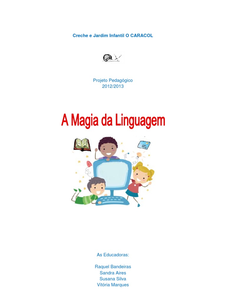A elaborao de um projeto pressupe que exista uma situao que tem de se modificar ou um problema que necessrio resolver. Esta inteno de mudana corresponde ao porqu do projeto, sua razo de existir. O problema deve ser pertinente e proporcionar o desenvolvimento a novas aprendizagens. Com o nosso projeto A Magia da Linguagem pretende-se que a criana atinja alguns objetivos relacionados com o desenvolvimento da linguagem, nomeadamente, atravs de histrias tradicionais, poesias, lengalengas, destrava lnguas, rimas, contos, entre outros. A escolha do nosso tema no s est relacionada com o domnio da linguagem oral e abordagem escrita, mas tambm ao nvel dos diferentes meios de comunicao, como a rdio, a televiso, o correio, o computador, etc. cada vez mais evidente o uso destes com objetivos educacionais e de integrao do cidado sociedade.