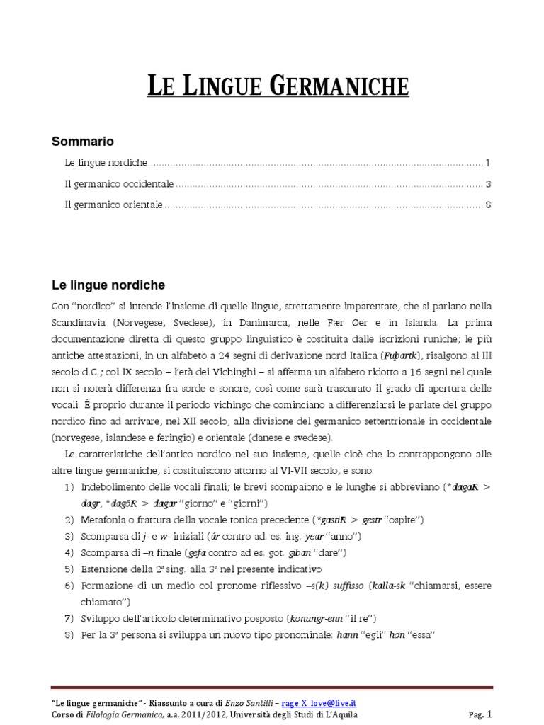 Le lingue germaniche - Riassunto a cura di Enzo Santilli rage_X_love@[Link] Corso di Filologia Germanica, a.a. 2011/2012, Universit degli Studi di LAquila