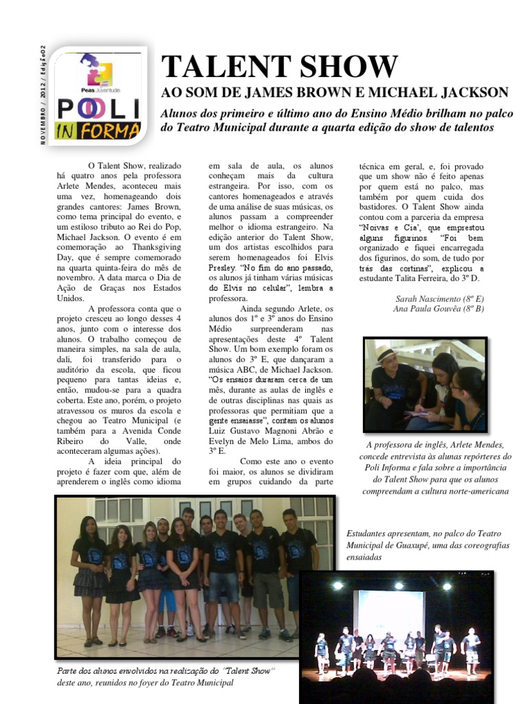 O Talent Show, realizado h quatro anos pela professora Arlete Mendes, aconteceu mais uma vez, homenageando dois grandes cantores: James Brown, como tema principal do evento, e um estiloso tributo ao Rei do Pop, Michael Jackson. O evento em comemorao ao Thanksgiving Day, que sempre comemorado na quarta quinta-feira do ms de novembro. A data marca o Dia de Ao de Graas nos Estados Unidos. A professora conta que o projeto cresceu ao longo desses 4 anos, junto com o interesse dos alunos. O trabalho comeou de maneira simples, na sala de aula, dali, foi transferido para o auditrio da escola, que ficou pequeno para tantas ideias e, ento, mudou-se para a quadra coberta. Este ano, porm, o projeto atravessou os muros da escola e chegou ao Teatro Municipal (e tambm para a Avenida Conde Ribeiro do Valle, onde aconteceram algumas aes). A ideia principal do projeto fazer com que, alm de aprenderem o ingls como idioma ______________ em sala de aula, os alunos conheam mais da cultura estrangeira. Por isso, com os cantores homenageados e atravs de uma anlise de suas msicas, os alunos passam a compreender melhor o idioma estrangeiro. Na edio anterior do Talent Show, um dos artistas escolhidos para serem homenageados foi Elvis Presley. No fim do ano passado, os alunos j tinham vrias msicas do Elvis no celular, lembra a professora. Ainda segundo Arlete, os alunos dos 1 e 3 anos do Ensino Mdio surpreenderam nas apresentaes deste 4 Talent Show. Um bom exemplo foram os alunos do 3 E, que danaram a msica ABC, de Michael Jackson. Os ensaios duraram cerca de um ms, durante as aulas de ingls e de outras disciplinas nas quais as professoras que permitiam que a gente ensaiasse, contam os alunos Luiz Gustavo Magnoni Abro e Evelyn de Melo Lima, ambos do 3 E. Como este ano o evento foi maior, os alunos se dividiram em grupos cuidando da parte _______________ tcnica em geral, e, foi provado que um show no feito apenas por quem est no palco, mas tambm por quem cuida dos bastidores. O Talent Show ainda contou com a parceria da empresa Noivas e Cia, que emprestou alguns figurinos. Foi bem organizado e fiquei encarregada dos figurinos, do som, de tudo por trs das cortinas, explicou a estudante Talita Ferreira, do 3 D. Sarah Nascimento (8 E) Ana Paula Gouva (8 B)