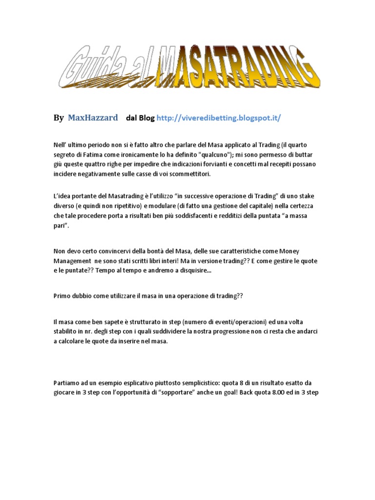 Nell ultimo periodo non si fatto altro che parlare del Masa applicato al Trading (il quarto segreto di Fatima come ironicamente lo ha definito "qualcuno"); mi sono permesso di buttar gi queste quattro righe per impedire che indicazioni forvianti e concetti mal recepiti possano incidere negativamente sulle casse di voi scommettitori. Lidea portante del Masatrading lutilizzo in successive operazione di Trading di uno stake diverso (e quindi non ripetitivo) e modulare (di fatto una gestione del capitale) nella certezza che tale procedere porta a risultati ben pi soddisfacenti e redditizi della puntata a massa pari.