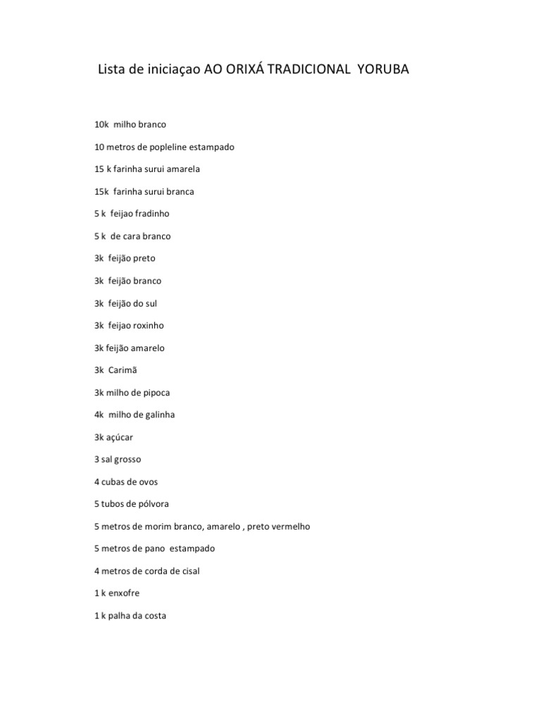 Avenidas,estrada ida e volta, 4 esquina prximo da roa e de sua casa, redemoinho Fundo do rio, praia , estabelecimento comercial, mata, cemitrio, igreja , shopp, porto, 7 tipos de pimentas , folhas de exu, chumbo,estanio , limalha de ferro , limalha de chave , solda , cobre alumnio , ao , alfinete atula, imas , prata ouro, uma pedra de minrio cristal, limalha de bronze , 2 facas sem cabos , 2 cabaas, 7 lanas de ferros, 1k de pregos 3 por 9 , p de bagre, p de pre, urutu ,dum dum e fum fum 21 moedas Azougue, carvo, lama de mangue, pedra lpiada waji, e lcool, iodo, ovos, navalha velha ,tezoura, ferradura, chifre de boi e de bode, moedas antigas e corrente, p de telha , p de tijolo , orelha de pau, casa de maribondo, , p de concha , 4 quartinha de barro a sem ala , jornal do dia, 2 punhal , guas de chuva , rio mar , min eral poo, coco, , garra de exu, , pedao de cobre, 2 latas de esmalte vermelho e preto ,2pincel para pinta o orix Carvo mineral, ogo, 1 pedra de mangans, 1 pedra de cristal de roxa , 6 pedras turmalina negra 7 balas de revolve 1 lguidas grande 2 quartinhas de barros , bichos , para batizar a maa , BICHOS DO EXU 1 bodi 4 galos , 1 picota 1 pombo sin za 2 galinhas Batizar a maca 2 akukos , , Pimenta do reio preta branca e muida Lista de so Paulo 500 g de bzios dente de leite para o jgo de bzios, 3 penas de ekodide 3 lekeleke 1 figa de marfim Che Che fum, 16 igbins 1 k de chumbo BIXHOS DO ROISA ELEDA ABORO, HOEM