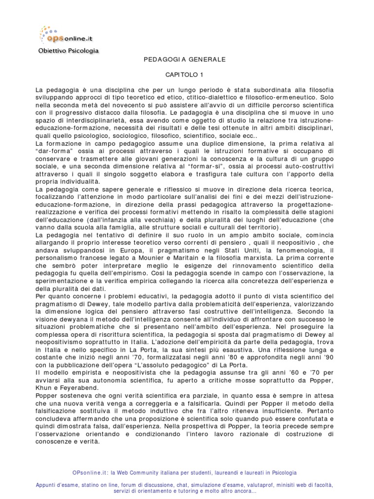 do approcci di tipo teoretico ed etico, ctitico-dialettico e filosofico-ermeneutico. Solo nella seconda met del novecento si pu assistere allavvio di un difficile percorso scientifica con il progressivo distacco dalla filosofia. Le padagogia una disciplina che si muove in uno spazio di interdisciplinariet, essa avendo come oggetto di studio la relazione tra istruzioneeducazione-formazione, necessit dei risultati e delle tesi ottenute in altri ambiti disciplinari, quali quello psicologico, sociologico, filosofico, scientifico, sociale ecc.. La formazione in campo pedagogico assume una duplice dimensione, la prima relativa al dar-forma ossia ai processi attraverso i quali le istruzioni formative si occupano di conservare e trasmettere alle giovani generazioni la conoscenza e la cultura di un gruppo sociale, e una seconda dimensione relativa al formar-si, ossia ai processi auto-costruttivi attraverso i quali il singolo soggetto elabora e trasfigura tale cultura con lapporto della propria individualit. La pedagogia come sapere generale e riflessico si muove in direzione dela ricerca teorica, focalizzando lattenzione in modo particolare sullanalisi dei fini e dei mezzi dellistruzioneeducazione-formazione, in direzione della prassi pedagogica attraverso la progettazionerealizzazione e verifica dei processi formativi mettendo in risalto la complessit delle stagioni delleducazione (dallinfanzia alla vecchiaia) e della pluralit dei luoghi delleducazione (che vanno dalla scuola alla famiglia, alle strutture sociali e culturali del territorio). La pedagogia nel tentativo di definire il suo ruolo in un ampio ambito sociale, comincia allargando il proprio interesse teoretico verso correnti di pensiero , quali il neopositivio , che andava svluppandosi in Europa, il pragmatismo negli Stati Uniti, la fenomenologia, il personalismo francese legato a Mounier e Maritain e la filosofia marxista. La prima corrente che sembr poter interpretare meglio le esigenze del rinnovamento scientifico della pedagogia fu quella dellempirismo. Cos la pedagogia scende in campo con losservazione, la sperimentazione e la verifica empirica collegando la ricerca alla concretezza dellesperienza e della pluralit dei dati. Per quanto concerne i problemi educativi, la pedagogia adott il punto di vista scientifico del pragmatismo di Dewey, tale modello partiva dalla problematicit dellesperienza, valorizzando la dimensione logica del pensiero attraverso fasi costruttive dellintelligenza. Secondo la visione dewyana il metodo dellintelligenza consente allindividuo di affrontare con successo le situazioni problematiche che si presentano nellambito dellesperienza. Nel proseguire la complessa opera di riscrittura scientifica, la pedagogia si sposta dal pragmatismo di Dewey al neopositivismo soprattutto in Italia. Ladozione dellempiricit da parte della pedagogia, trova in Italia e nello specifico in La Porta, la sua sintesi pi esaustiva. Una riflessione lunga e costante che inizi negli anni 70, formalizzatasi negli anni 80 e approfondita negli anni 90 con la pubblicazione dellopera Lassoluto pedagogico di La Porta. Il modello empirista e neopositivista che la pedagogia assunse tra gli anni 60 e 70 per avviarsi alla sua autonomia scientifica, fu aperto a critiche mosse soprattutto da Popper, Khun e Feyerabend. Popper sosteneva che ogni verit scientifica era parziale, in quanto essa sempre in attesa che una nuova verit venga a correggerla e a falsificarla. Quindi per Popper il metodo della falsificazione sostituiva il metodo induttivo che fra laltro riteneva insufficiente. Pertanto concludeva affermando che una proposizione scientifica solo quando pu essere confutata e quindi dimostrata falsa, dallesperienza. Nella prospettiva di Popper, la teoria precede sempre losservazione orientando e condizionando lintero lavoro razionale di costruzione di conoscenze e verit.