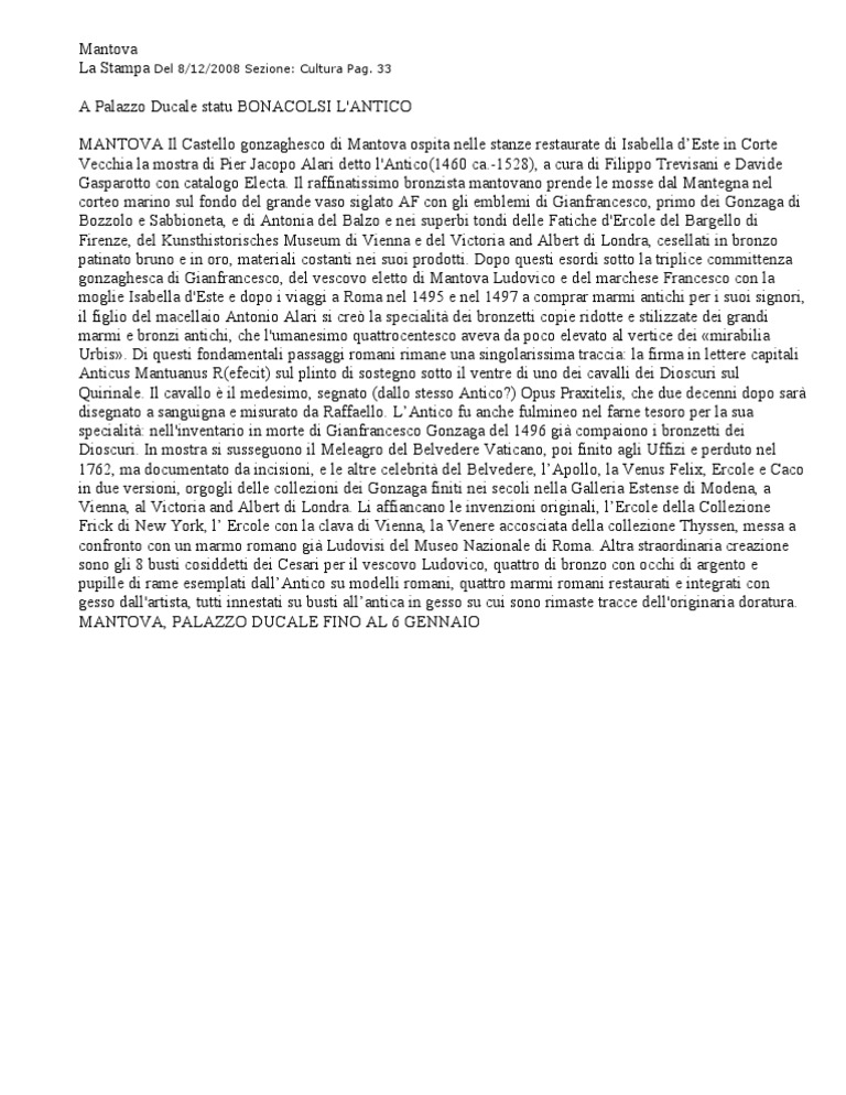 33 A Palazzo Ducale statu BONACOLSI L'ANTICO MANTOVA Il Castello gonzaghesco di Mantova ospita nelle stanze restaurate di Isabella dEste in Corte Vecchia la mostra di Pier Jacopo Alari detto l'Antico(1460 ca.-1528), a cura di Filippo Trevisani e Davide Gasparotto con catalogo Electa. Il raffinatissimo bronzista mantovano prende le mosse dal Mantegna nel corteo marino sul fondo del grande vaso siglato AF con gli emblemi di Gianfrancesco, primo dei Gonzaga di Bozzolo e Sabbioneta, e di Antonia del Balzo e nei superbi tondi delle Fatiche d'Ercole del Bargello di Firenze, del Kunsthistorisches Museum di Vienna e del Victoria and Albert di Londra, cesellati in bronzo patinato bruno e in oro, materiali costanti nei suoi prodotti. Dopo questi esordi sotto la triplice committenza gonzaghesca di Gianfrancesco, del vescovo eletto di Mantova Ludovico e del marchese Francesco con la moglie Isabella d'Este e dopo i viaggi a Roma nel 1495 e nel 1497 a comprar marmi antichi per i suoi signori, il figlio del macellaio Antonio Alari si cre la specialit dei bronzetti copie ridotte e stilizzate dei grandi marmi e bronzi antichi, che l'umanesimo quattrocentesco aveva da poco elevato al vertice dei mirabilia Urbis. Di questi fondamentali passaggi romani rimane una singolarissima traccia: la firma in lettere capitali Anticus Mantuanus R(efecit) sul plinto di sostegno sotto il ventre di uno dei cavalli dei Dioscuri sul Quirinale. Il cavallo il medesimo, segnato (dallo stesso Antico?) Opus Praxitelis, che due decenni dopo sar disegnato a sanguigna e misurato da Raffaello. LAntico fu anche fulmineo nel farne tesoro per la sua specialit: nell'inventario in morte di Gianfrancesco Gonzaga del 1496 gi compaiono i bronzetti dei Dioscuri. In mostra si susseguono il Meleagro del Belvedere Vaticano, poi finito agli Uffizi e perduto nel 1762, ma documentato da incisioni, e le altre celebrit del Belvedere, lApollo, la Venus Felix, Ercole e Caco in due versioni, orgogli delle collezioni dei Gonzaga finiti nei secoli nella Galleria Estense di Modena, a Vienna, al Victoria and Albert di Londra. Li affiancano le invenzioni originali, lErcole della Collezione Frick di New York, l Ercole con la clava di Vienna, la Venere accosciata della collezione Thyssen, messa a confronto con un marmo romano gi Ludovisi del Museo Nazionale di Roma. Altra straordinaria creazione sono gli 8 busti cosiddetti dei Cesari per il vescovo Ludovico, quattro di bronzo con occhi di argento e pupille di rame esemplati dallAntico su modelli romani, quattro marmi romani restaurati e integrati con gesso dall'artista, tutti innestati su busti allantica in gesso su cui sono rimaste tracce dell'originaria doratura. MANTOVA, PALAZZO DUCALE FINO AL 6 GENNAIO