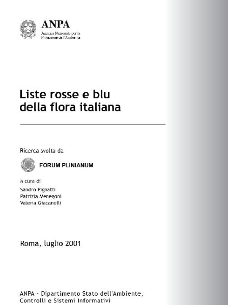 sibilit di arrivare a Liste Blu, cio ad un catalogo di specie la cui situazione di rischio possa venire considerata come ragionevolmente superata. Tuttavia lidentificazione delle specie in fase di ripresa richiede un monitoraggio che tuttora agli inizi. Queste Liste Blu in avvenire dovrebbero svilupparsi e costituire il necessario riscontro del successo delle politiche ambientali. La parte principale dellinformazione qui presentata riguarda le specie vegetali considerate a rischio di estinzione per il territorio italiano dalla direttiva Habitat. Attraverso la collaborazione di specialisti e studiosi con ampie conoscenze territoriali stato possibile identificare la situazione attuale di queste specie e costituire una sorta di inventario dello stock vivente, cosa che fino ad ora non esisteva. In alcuni casi si giunti ad un risultato imprevisto: alcune specie risultano estinte o addirittura sono state indicate in base a segnalazioni non confermate; altre specie non vengono osservate da molti anni e sembrano svanite nel nulla, anche se questo non sufficiente per considerarle estinte. Sulla base di questi dati quindi possibile dare un contributo per rendere pi attendibili i sistemi conoscitivi riguardanti lambiente italiano e le relative banche dati e contemporaneamente segnalare agli studiosi lesistenza di problemi ancora aperti. Questa documentazione ha lo scopo di rappresentare un punto di riferimento obiettivo per attivit future rivolte alla conservazione di alcuni aspetti peculiari ed insostituibili del mondo vegetale del nostro paese. Un lavoro di questo tipo sempre il risultato di una collaborazione tra molti. Il merito delliniziativa va riconosciuto allANPA, che ha svolto questa attivit nellambito dei suoi compiti istituzionali di promozione della ricerca in particolare per quanto concerne una sempre migliore conoscenza dellambiente, quale presupposto imprescindibile di qualsiasi politica di tutela. Il Forum Plinianum ha coordinato la fase di raccolta, analisi ed elaborazione dei dati, avvalendosi del contributo di scienziati e studiosi italiani che si occupano a diversi livelli delle problematiche legate alla tassonomia vegetale, allecologia, alla conservazione. Gli autori dellopera hanno poi proceduto alle scelte di comunicazione scientifica, quindi alla redazione dei testi generali e allelaborazione delle parti grafiche e di tutti i materiali necessari alla compilazione dellopera sia in formato cartaceo che multimediale. Linformazione scientifica e tecnica viene presentata in una forma facilmente accessibile ed corredata da un ampio materiale fotografico e documentario raccolto a questo scopo. Sandro Pignatti