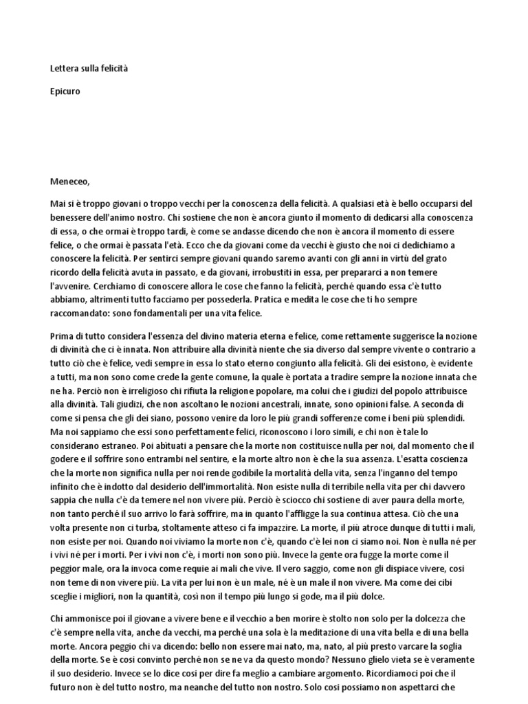Meneceo, Mai si troppo giovani o troppo vecchi per la conoscenza della felicit. A qualsiasi et bello occuparsi del benessere dell'animo nostro. Chi sostiene che non ancora giunto il momento di dedicarsi alla conoscenza di essa, o che ormai troppo tardi, come se andasse dicendo che non ancora il momento di essere felice, o che ormai passata l'et. Ecco che da giovani come da vecchi giusto che noi ci dedichiamo a conoscere la felicit. Per sentirci sempre giovani quando saremo avanti con gli anni in virt del grato ricordo della felicit avuta in passato, e da giovani, irrobustiti in essa, per prepararci a non temere l'avvenire. Cerchiamo di conoscere allora le cose che fanno la felicit, perch quando essa c' tutto abbiamo, altrimenti tutto facciamo per possederla. Pratica e medita le cose che ti ho sempre raccomandato: sono fondamentali per una vita felice. Prima di tutto considera l'essenza del divino materia eterna e felice, come rettamente suggerisce la nozione di divinit che ci innata. Non attribuire alla divinit niente che sia diverso dal sempre vivente o contrario a tutto ci che felice, vedi sempre in essa lo stato eterno congiunto alla felicit. Gli dei esistono, evidente a tutti, ma non sono come crede la gente comune, la quale portata a tradire sempre la nozione innata che ne ha. Perci non irreligioso chi rifiuta la religione popolare, ma colui che i giudizi del popolo attribuisce alla divinit. Tali giudizi, che non ascoltano le nozioni ancestrali, innate, sono opinioni false. A seconda di come si pensa che gli dei siano, possono venire da loro le pi grandi sofferenze come i beni pi splendidi. Ma noi sappiamo che essi sono perfettamente felici, riconoscono i loro simili, e chi non tale lo considerano estraneo. Poi abtuati a pensare che la morte non costituisce nulla per noi, dal momento che il godere e il soffrire sono entrambi nel sentire, e la morte altro non che la sua assenza. L'esatta coscienza che la morte non significa nulla per noi rende godibile la mortalit della vita, senza l'inganno del tempo infinito che indotto dal desiderio dell'immortalit. Non esiste nulla di terribile nella vita per chi davvero sappia che nulla c' da temere nel non vivere pi. Perci sciocco chi sostiene di aver paura della morte, non tanto perch il suo arrivo lo far soffrire, ma in quanto l'affligge la sua continua attesa. Ci che una volta presente non ci turba, stoltamente atteso ci fa impazzire. La morte, il pi atroce dunque di tutti i mali, non esiste per noi. Quando noi viviamo la morte non c', quando c' lei non ci siamo noi. Non nulla n per i vivi n per i morti. Per i vivi non c', i morti non sono pi. Invece la gente ora fugge la morte come il peggior male, ora la invoca come requie ai mali che vive. Il vero saggio, come non gli dispiace vivere, cosi non teme di non vivere pi. La vita per lui non un male, n un male il non vivere. Ma come dei cibi sceglie i migliori, non la quantit, cos non il tempo pi lungo si gode, ma il pi dolce. Chi ammonisce poi il giovane a vivere bene e il vecchio a ben morire stolto non solo per la dolcezza che c' sempre nella vita, anche da vecchi, ma perch una sola la meditazione di una vita bella e di una bella morte. Ancora peggio chi va dicendo: bello non essere mai nato, ma, nato, al pi presto varcare la soglia della morte. Se cosi convinto perch non se ne va da questo mondo? Nessuno glielo vieta se veramente il suo desiderio. Invece se lo dice cosi per dire fa meglio a cambiare argomento. Ricordiamoci poi che il futuro non del tutto nostro, ma neanche del tutto non nostro. Solo cosi possiamo non aspettarci che
