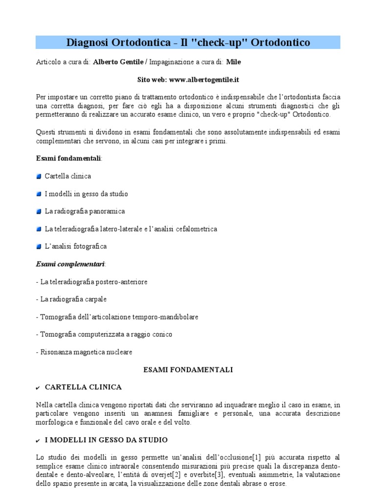 Articolo a cura di: Alberto Gentile / Impaginazione a cura di: Mile Sito web: [Link] Per impostare un corretto piano di trattamento ortodontico indispensabile che lortodontista faccia una corretta diagnosi, per fare ci egli ha a disposizione alcuni strumenti diagnostici che gli permetteranno di realizzare un accurato esame clinico, un vero e proprio "check-up" Ortodontico. Questi strumenti si dividono in esami fondamentali che sono assolutamente indispensabili ed esami complementari che servono, in alcuni casi per integrare i primi. Esami fondamentali: Cartella clinica I modelli in gesso da studio La radiografia panoramica La teleradiografia latero-laterale e lanalisi cefalometrica Lanalisi fotografica Esami complementari: - La teleradiografia postero-anteriore - La radiografia carpale - Tomografia dellarticolazione temporo-mandibolare - Tomografia computerizzata a raggio conico - Risonanza magnetica nucleare ESAMI FONDAMENTALI