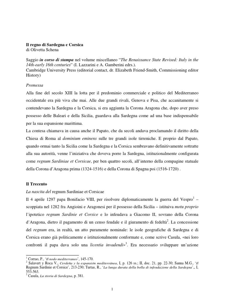 Italy in the 14th-early 16th centuries (I. Lazzarini e A. Gamberini edrs.). Cambridge University Press (editorial contact, dr. Elizabeth Friend-Smith, Commissioning editor History) Premessa Alla fine del secolo XIII la lotta per il predominio commerciale e politico del Mediterraneo occidentale era pi viva che mai. Alle due grandi rivali, Genova e Pisa, che accanitamente si contendevano la Sardegna e la Corsica, si era aggiunta la Corona Aragona che, dopo aver preso possesso delle Baleari e della Sicilia, guardava alla Sardegna come ad una base indispensabile per la sua espansione marittima. La contesa chiamava in causa anche il Papato, che da secoli andava proclamando il diritto della Chiesa di Roma al dominium eminens sulle tre grandi isole tirreniche. E proprio dal Papato, quando ormai tanto la Sicilia come la Sardegna e la Corsica sembravano definitivamente sottratte alla sua autorit, venne liniziativa che doveva porre la Sardegna, istituzionalmente configurata come regnum Sardiniae et Corsicae, per ben quattro secoli, allinterno della compagine statuale della Corona dAragona prima (1324-1516) e della Corona di Spagna poi (1516-1720) .