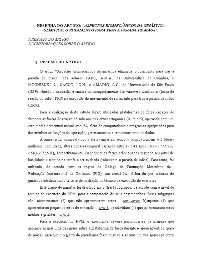 1) RESUMO DO ARTIGO O artigo Aspectos biomecnicos da ginstica olmpica: o rolamento para trs parada de mos, dos autores FARO, A.M.A., da Universidade de Coimbra, e MOCHIZUKI, L.; SACCO, I.C.N.; e AMADIO, A.C., da Universidade de So Paulo (USP), aborda a descrio e anlise do comportamento das variveis dinmicas (fora de reao do solo - FRS) na execuo do movimento de rolamento para trs parada de mos (RPM). Para a realizao deste estudo foram utilizadas plataformas de fora capazes de fornecer as foras de reao do solo nos trs eixos ortogonais (X, Y e Z), operando com um erro mdio percentual menor que 1%, alm de computadores e programas apropriados para desenvolver as funes de aquisio, gerenciamento e armazenamento de dados. A amostra foi composta por 7 (sete) ginastas, sendo 5 (cinco) homens e 2 (duas) mulheres, com idade, altura e massa corporal variando entre 19 e 41 anos, 163 e 177,5 cm, e 56,4 e 72,5 Kg, respectivamente. Os indivduos foram selecionados segundo seu nvel de habilidade e tcnica na tarefa a ser avaliada (rolamento parada de mos). Para tanto, foi utilizado, de acordo com as regras do Cdigo de Pontuao Masculino da Federao Internacional de Ginstica (FIG), um check-list, elaborado por rbitros de ginstica artstica como critrio de avaliao da tcnica de execuo do exerccio. Este grupo de ginastas foi dividido em 3 (trs) subgrupos, de acordo com o nvel de tcnica de execuo do RPM, para a comparao de seus desempenhos. Esses subgrupos so: a)executantes (2) que no apresentaram erros sem erros; b)sujeitos (1) que apresentaram pequenos erros de execuo erro 1; c)indivduos (4) que apresentaram erros mdios e grandes erro 2. Para a execuo do RPM, o executante deveria posicionar-se de maneira que apoiasse apenas uma das mos sobre a plataforma de fora durante o apoio invertido (para de mos), para que o registro da plataforma fosse relativo a apenas um dos apoios (o outro