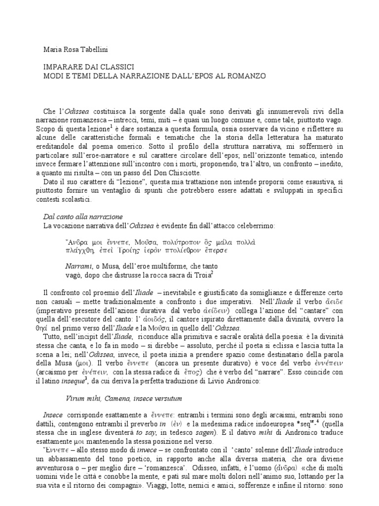 Questo articolo la rielaborazione di una mia lezione agli studenti del II anno di corso della SSIS di Siena, svoltasi il 26 novembre 2008. 2 Omero, Odissea, I, vv. 1-2, traduzione di G. Aurelio Privitera, Fondazione Valla-Mondadori, Milano 1981. Nella traduzione di Ippolito Pindemonte, i due versi suonano: Musa, quelluom di multiforme ingegno / dimmi, che molto err, poichebbe a terra / gittate dIlon le sacre torri. 3 Cfr. P. Chantraine, Dictionnaire tymologique de la langue grecque. Histoire de mots, Paris 1968-1980, p. 349. 4 Cfr. M. Bettini, Letteratura latina, La Nuova Italia, Firenze 1995, p. 113 5 La traduzione italiana del Monti (il traduttor dei traduttor dOmero) non permette di riconoscere la gradualit con cui il poeta conquista il proprio spazio nel genere epico, dato che inserisce arbitrariamente il dativo gi nel proemio dellIliade: Cantami o Diva del Pelide Achille lira funesta. 6 Dante, Inf., II, vv. 7-9. 7 Dante, Par., II, 7-9. 8 Anche se da alcuni posto in discussione, il verso considerato autentico dagli studiosi -tutti assai autorevoli- che ho citato. 9 M. Zambarbieri, LOdissea com. Lettura critica (2 voll.), LED, Milano 2002, vol. I, p. 132. 10 Una disamina filologica del termine condotta entro un orizzonte didattico si pu trovare in M. Pintacuda, R. Trombino, Hellenes, Antologia omerica, Palumbo, Palermo 1998, p. 246. 11 G. Pasquali, Il proemio dellOdissea, in Pagine stravaganti, Sansoni, Firenze, II, p. 295 12 Cfr. F. Codino, Introduzione a Omero, Einaudi, Torino 1965 13 L. E. Rossi, Lideologia delloralit fino a Platone, in Lo spazio letterario della Grecia antica I, Salerno Editrice, Roma 1992, p. 82. 14 Un esempio tra i molti: il ciclo pittorico sulla Gerusalemme liberata dipinto da Paolo Finoglio su commissione dei conti Acquaviva di Conversano. Il pittore, chiamato allopera intorno al 1634, cur una vera e propria illustrazione degli episodi pi celebri della Gerusalemme: da Olindo e Sofronia, al duello di Tancredi e Argante, alla selva incantata, e cos via. 15 Cfr. M. Bachtin, Estetica e romanzo. Teoria e storia del discorso narrativo, trad. it., Einaudi, Torino 1997. Si tratta di scritti degli anni 20 e 30 e pubblicati postumi. 16 Per gli argomenti in qestione, capitale il saggio di Aurbach La cicatrice di Ulisse, in Mimesis, trad. it., Einaudi, Torino 1979 8 17 M. Zambarbieri, op. cit. vol I, p. 132. 18 Calvino aveva iniziato a riflettere sui confini in unopera che doveva far parte di quelle lezioni americane che la morte, nel 1985, gli imped di tenere ad Harvard. Su questo e sullimportanza in genere dellincipit e dellexplicit si veda Giulio Ferroni, I confini della critica, Guida, Napoli 2005, pp. 29 e sgg.. SullOdissea Calvino era gi intervenuto in un saggio capitale: I. Calvino, Le Odissee nellOdissea, in Perch leggere i classici, Mondadori, Milano, 1991. 19 Nel passo Odisseo racconta di aver cercato di abbracciare la madre, ma inutilmente, riecheggiando cos la scena dellIliade in cui Achille tenta invano di abbracciare lanima di Patroclo (Il. XXIII 99-101), e codificando un gesto che sar imitato in seguito, da Virgilio, quando racconter di Enea che non riesce ad abbracciare lombra di Anchise (Aen. II, 792-794), e da Dante, nellincontro con Casella (Purg. II, 80-81). 20 La traduzione, qui come quella dei due passi seguenti, di M. Zambarbieri, op. cit. I, pp. 625, 654, 656. 21 Odissea, XI, 134-137. Zambarbieri (op cit., I, p. 768) nota che la forma profetica e linsufficienza narrativa del testo rendono ardua linterpretazione di ejx aJlov" (134). La locuzione infatti pu significare tanto dal mare quanto fuori dal mare. In questultimo senso lintese Pascoli immaginando la peregrinazione a ritroso del vecchio Odisseo (Pascoli, Lultimo viaggio, V, 36). 22 Odissea, XI, 207-8. 23 A. Manguel, Omero. Iliade e Odissea. Una biografia. Newton Compton, Roma 2007, p. 104. 24 Cfr. B. Snell, Luomo nella concezione di Omero, in La cultura greca e le origini del pensiero europeo, Einaudi, Torino, 1963 25 cfr. J. P. Vernant, Mito e pensiero presso i Greci, trad. it. Einaudi, Torino 1978 26 Dante, Par. XVII, 127-8 27 George Steiner, introduzione a Homer in English, Penguin Books, London 1996. La citazione si trova in A. Manguel, op. cit., p. 101. 28 Cfr. F. Ferrucci, Lassedio e il ritorno. Omero e gli archetipi della narrazione, Mondadori, Milano 1992