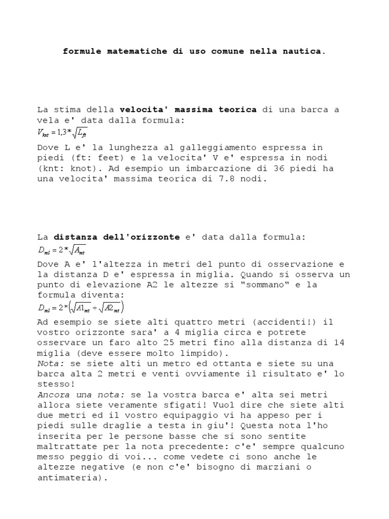 La distanza dell'orizzonte e' data dalla formula: Dove A e' l'altezza in metri del punto di osservazione e la distanza D e' espressa in miglia. Quando si osserva un punto di elevazione A2 le altezze si "sommano" e la formula diventa: Ad esempio se siete alti quattro metri (accidenti!) il vostro orizzonte sara' a 4 miglia circa e potrete osservare un faro alto 25 metri fino alla distanza di 14 miglia (deve essere molto limpido). Nota: se siete alti un metro ed ottanta e siete su una barca alta 2 metri e venti ovviamente il risultato e' lo stesso! Ancora una nota: se la vostra barca e' alta sei metri allora siete veramente sfigati! Vuol dire che siete alti due metri ed il vostro equipaggio vi ha appeso per i piedi sulle draglie a testa in giu'! Questa nota l'ho inserita per le persone basse che si sono sentite maltrattate per la nota precedente: c'e' sempre qualcuno messo peggio di voi... come vedete ci sono anche le altezze negative (e non c'e' bisogno di marziani o antimateria).