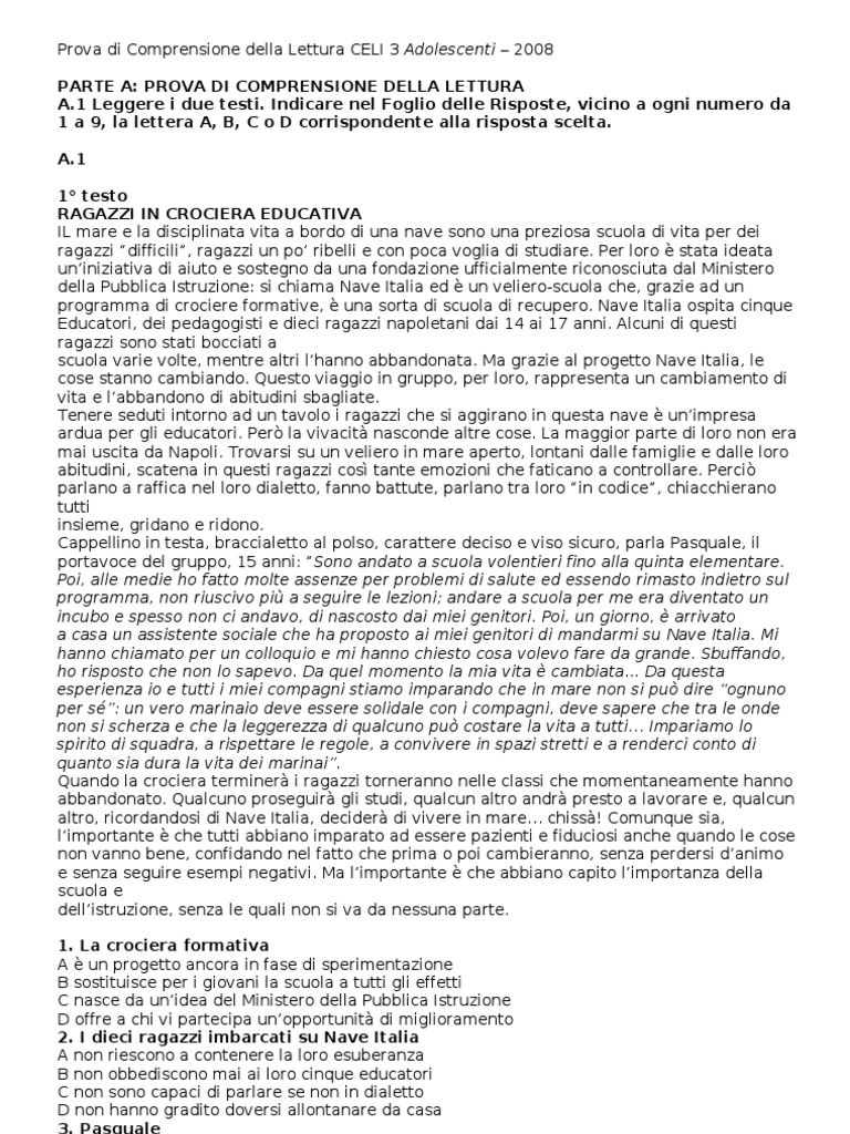 Prova di Comprensione della Lettura CELI 3 Adolescenti 2008 PARTE A: PROVA DI COMPRENSIONE DELLA LETTURA A.