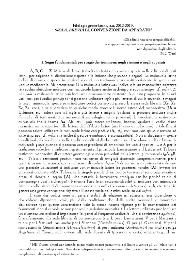 1. Segni fondamentali per i sigla dei testimoni: negli stemmi e negli apparati A, B, C Z. Maiuscola latina (talvolta in bold o in corsivo, specie nelle edizioni di testi latini, per esigenze di distinzione rispetto alla lezione che precede o segue). La maiuscola latina indica di norma, e specie in edizioni recenti, un testimone manoscritto esistente: in genere, un codice medioevale. Ma attenzione: 1) la maiuscola latina non indica solo un manoscritto esistente ( vecchia abitudine indicare con maiuscole latine anche archetipo e subarchetipo: cf. infra); 2) non solo la maiuscola latina pu indicare un manoscritto esistente. A questo proposito, in alcuni casi (mai per i codici principali) si possono utilizzare sigla a pi lettere, di cui la seconda, e magari la terza, minuscola, specie se si indicano codici conservati presso la stessa sede libraria (Xr, Xs, Zc, Zr, etc.), o se si desidera in qualche modo evocare il nome esteso del manoscritto (Ur = Urbinate, etc.; talora con tali sigle a pi lettere e magari parlanti si possono indicare anche famiglie di testimoni, cio manoscritti genealogicamente prossimi). Lassociazione maiuscolaminuscola (nella forma Aa, Ab, etc.) pu essere utilizzata, inoltre, qualora i codici siano numericamente superiori alle lettere dellalfabeto latino (ma il caso molto raro); a tale fine si possono talora utilizzare le maiuscole latine con pedice (A1, A2, etc.; non con apice, riservato ad altro impiego: cf. infra; ma anche il pedice ambiguo e sconsigliabile). Non si disdegna specie in edizioni pi vecchie, e nelle tradizioni editoriali che tuttora ne dipendono - di utilizzare la maiuscola greca quando si possono creare problemi di omonimia fra codici (per es., L e per la tradizione sofoclea, a indicare rispettivamente il principale Laurenziano e il Leidense). Talora i testimoni manoscritti di carattere gnomologico sono preceduti dalla lettera g minuscola (gA, gB, etc.). Talora i testimoni perduti (non nel senso di antigrafi ricostruiti congetturalmente, per i quali si usano le minuscole, ma nel senso di codices deperditi di cui rimane testimoniata almeno una parziale collazione) si indicano con maiuscole latine fra parentesi tonde: (A); ovvero fra parentesi uncinate: <A>. Talora, se le singole parole di un codice (esistente) sono oggi svanite o erase, si ricorre al segno [A], che tuttavia fortemente ambiguo (anche perch talora si contrassegna cos larchetipo!). Permane luso (non raccomandabile) di indicare con minuscole latine i codici ritenuti di importanza secondaria o nulla (recentiores deteriores): a, b, etc. (ma ci genera una grave confusione rispetto alluso normale delle minuscole, su cui infra). I sigla dei codici sono in genere stabili di edizione in edizione: essi dipendono o dovrebbero dipendere, cio, pi dalla tradizione che dalle scelte personali e innovative delleditore (per queste convenzione vale la stessa norma vigente per la numerazione dei frammenti: non si cambia se non per reali e serissime necessit!). La lettera utilizzata pu indicare un riconosciuto ordine dimportanza (si pensi al frequente codice A, che si sottintende optimus), fare riferimento alla sede libraria di conservazione (e.g. L per i Laurenziani, V per i Marciani e talora per i Vaticani, ma anche per i Viennesi [Vindobonenses], O per gli Oxoniensi, H per i manoscritti di Gerusalemme [Hierosolymitani], A per i milanesi [Ambrosiani] ma anche per gli Angelicani di Roma, etc.), ovvero alla sede libraria di (presunta o certa) origine (e.g., il ms.