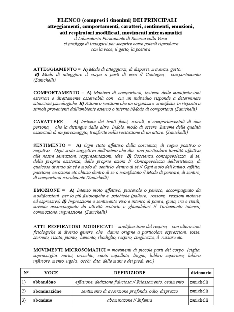 ATTEGGIAMENTO = A) Modo di atteggiarsi, di disporsi, movenza, gesto. B) Modo di atteggiare il corpo o parti di esso // Contegno, comportamento (Zanichelli) COMPORTAMENTO = A) Maniera di comportarsi, insieme delle manifestazioni esteriori e direttamente osservabili con cui un individuo risponde a determinate situazioni psicologiche. B) Azione o reazione che un organismo manifesta in risposta a stimoli provenienti dall'ambiente esterno o interno //Modo di comportarsi (Zanichelli) CARATTERE = A) Insieme dei tratti fisici, morali, e comportamentali di una persona, che la distingue dalle altre. Indole, modo di essere. Insieme delle qualit essenziali di un personaggio, trasferite nella recitazione di un attore. (Zanichelli) SENTIMENTO = A) Ogni stato affettivo della coscienza, di segno positivo o negativo. Ogni moto soggettivo dell'animo che dia una particolare tonalit affettiva alle nostre sensazioni, rappresentazioni, idee B) Coscienza, consapevolezza di s, della propria esistenza, delle proprie azioni // Consapevolezza dell'esistenza, di qualcosa diverso da s e modo di sentirlo dentro di s // Ogni moto dell'animo, affetto, passione, emozione etc chiuso dentro di s o manifestato // Modo di pensare, di sentire, di comportarsi moralmente (Zanichelli) EMOZIONE = A) Intenso moto affettivo, piacevole o penoso, accompagnato da modificazioni per lo pi fisiologiche e psichiche (pallore, rossore, reazioni motorie ed espressive) B) Impressione o sentimento vivo e intenso di paura, gioia, ira e simili, sovente accompagnato da attivit motorie e ghiandolari // Turbamento intenso; commozione, impressione (Zanichelli) ATTI RESPIRATORI MODIFICATI = modificazione del respiro, con alterazioni fisiologiche di diverso genere, che danno origine a particolari espressioni: tosse, sternuto, risata, pianto, lamento, sbadiglio, sospiro, singhiozzo, il russare etc. MOVIMENTI MICROSOMATICI = movimenti di piccole parti del corpo (ciglia, sopracciglia, narici, orecchie, cuoio capelluto, lingua, labbro superiore, labbro inferiore, mento, ugola, occhi, dita delle mani e dei piedi, etc.) N 1) 2) 3) VOCE abbandno abominazine abomnio DEFINIZIONE effusione, dedizione fiduciosa // Rilassamento, cedimento sentimento di avversione profonda, odio, disprezzo abominazone // Infamia dizionario zanichelli zanichelli zanichelli
