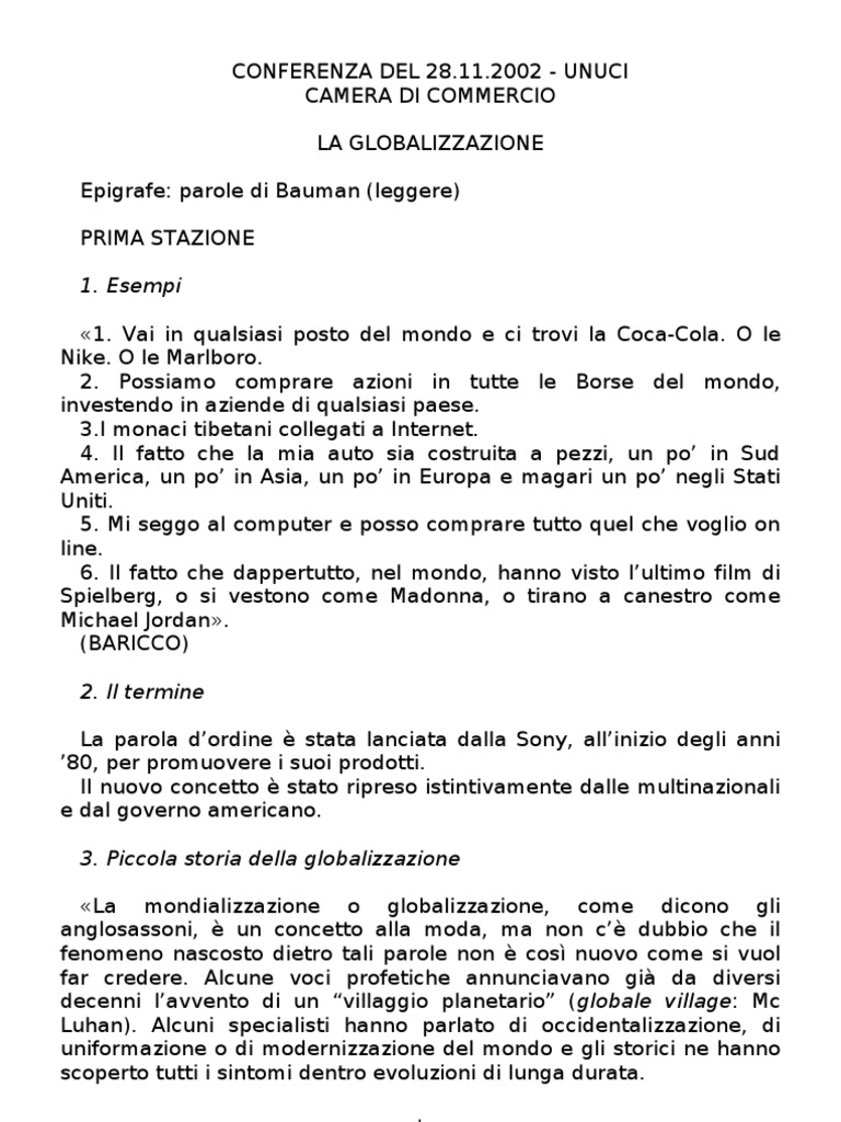 CONFERENZA DEL 28.11.2002 - UNUCI CAMERA DI COMMERCIO LA GLOBALIZZAZIONE Epigrafe: parole di Bauman (leggere) PRIMA STAZIONE 1. Esempi 1.
