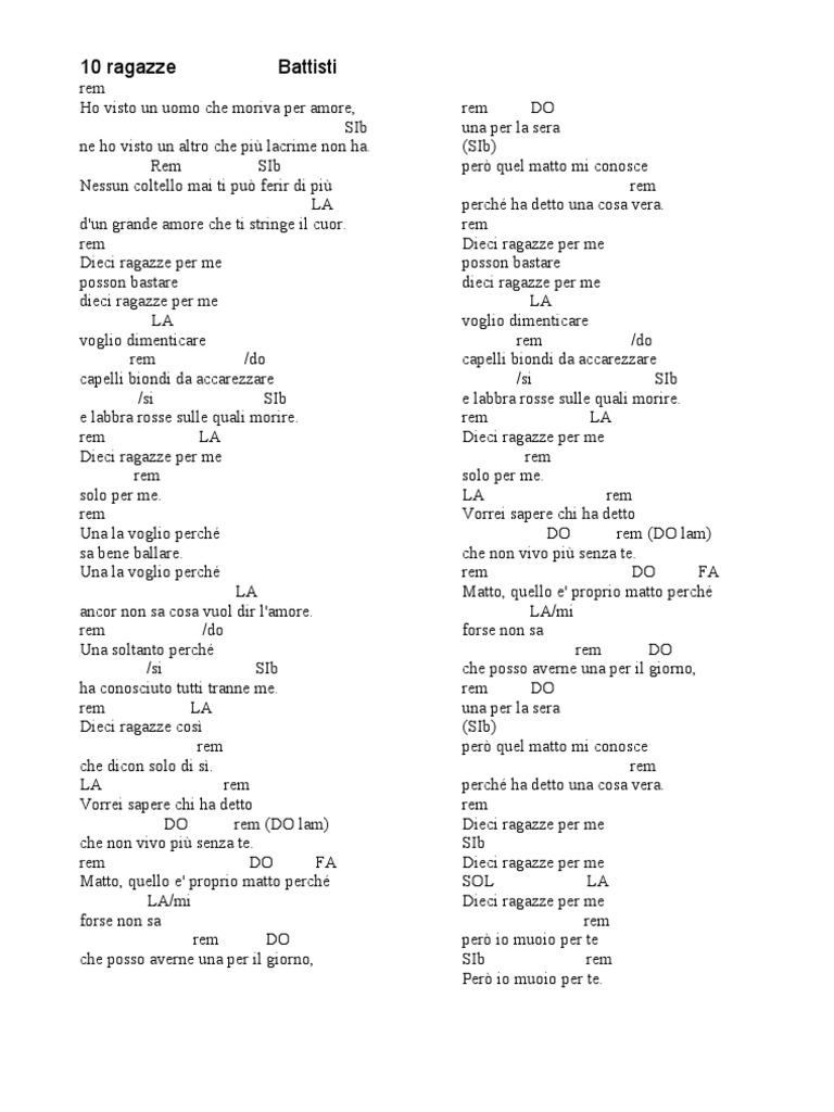 rem Ho visto un uomo che moriva per amore, SIb ne ho visto un altro che pi lacrime non ha. Rem SIb Nessun coltello mai ti pu ferir di pi LA d'un grande amore che ti stringe il cuor. rem Dieci ragazze per me posson bastare dieci ragazze per me LA voglio dimenticare rem /do capelli biondi da accarezzare /si SIb e labbra rosse sulle quali morire. rem LA Dieci ragazze per me rem solo per me. rem Una la voglio perch sa bene ballare. Una la voglio perch LA ancor non sa cosa vuol dir l'amore. rem /do Una soltanto perch /si SIb ha conosciuto tutti tranne me. rem LA Dieci ragazze cos rem che dicon solo di s. LA rem Vorrei sapere chi ha detto DO rem (DO lam) che non vivo pi senza te. rem DO FA Matto, quello e' proprio matto perch LA/mi forse non sa rem DO che posso averne una per il giorno,
