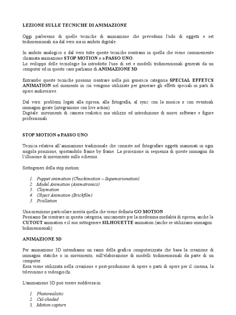 sia dal vero sia in ambito digitale. In ambito analogico o dal vero tutte queste tecniche rientrano in quella che viene comunemente chiamata animazione STOP MOTION o a PASSO UNO. Lo sviluppo delle tecnologie ha introdotto l'uso di set e modelli tridimensionali generati da un computer ed in questo caso parliamo di ANIMAZIONE 3D Entrambe queste tecniche possono rientrare nella pi generica categoria SPECIAL EFFETCS ANIMATION nel momento in cui vengono utilizzate per generare gli effetti speciali in parti di opere audiovisive. Dal vero: problemi legati alla ripresa, alla fotografia, al sync con la musica o con eventuali immagini girate (integrazione con live action) Digitale: movimenti di camera realistici ma utilizzo ed introduzione di nuovi software e figure professionali STOP MOTION o PASSO UNO Tecnica relativa allanimazione tradizionale che consiste nel fotografare oggetti inanimati in ogni singola posizione, spostandolo frame by frame. La proiezione in sequenza di queste immagini d lillusione di movimento sullo schermo. Sottogeneri della stop motion: 1. 2. 3. 4. 5. Puppet animation (Chuckimation Supemarionation) Model Animation (Animatronics) Claymation Object Animation (Brickfilm) Pixillation