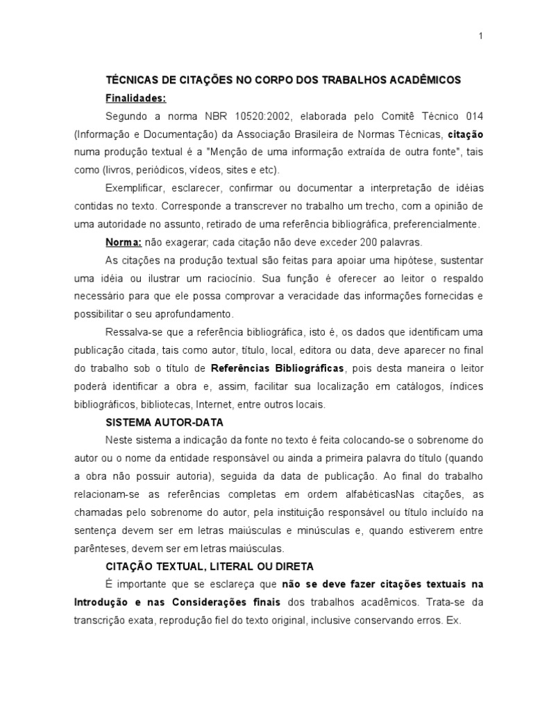 TCNICAS DE CITAES NO CORPO DOS TRABALHOS ACADMICOS Finalidades: Segundo a norma NBR 10520:2002, elaborada pelo Comit Tcnico 014 (Informao e Documentao) da Associao Brasileira de Normas Tcnicas, citao numa produo textual a "Meno de uma informao extrada de outra fonte", tais como (livros, peridicos, vdeos, sites e etc). Exemplificar, esclarecer, confirmar ou documentar a interpretao de idias contidas no texto. Corresponde a transcrever no trabalho um trecho, com a opinio de uma autoridade no assunto, retirado de uma referncia bibliogrfica, preferencialmente. Norma: no exagerar; cada citao no deve exceder 200 palavras. As citaes na produo textual so feitas para apoiar uma hiptese, sustentar uma idia ou ilustrar um raciocnio. Sua funo oferecer ao leitor o respaldo necessrio para que ele possa comprovar a veracidade das informaes fornecidas e possibilitar o seu aprofundamento. Ressalva-se que a referncia bibliogrfica, isto , os dados que identificam uma publicao citada, tais como autor, ttulo, local, editora ou data, deve aparecer no final do trabalho sob o ttulo de Referncias Bibliogrficas, pois desta maneira o leitor poder identificar a obra e, assim, facilitar sua localizao em catlogos, ndices bibliogrficos, bibliotecas, Internet, entre outros locais. SISTEMA AUTOR-DATA Neste sistema a indicao da fonte no texto feita colocando-se o sobrenome do autor ou o nome da entidade responsvel ou ainda a primeira palavra do ttulo (quando a obra no possuir autoria), seguida da data de publicao. Ao final do trabalho relacionam-se as referncias completas em ordem alfabticasNas citaes, as chamadas pelo sobrenome do autor, pela instituio responsvel ou ttulo includo na sentena devem ser em letras maisculas e minsculas e, quando estiverem entre parnteses, devem ser em letras maisculas. CITAO TEXTUAL, LITERAL OU DIRETA importante que se esclarea que no se deve fazer citaes textuais na Introduo e nas Consideraes finais dos trabalhos acadmicos. Trata-se da transcrio exata, reproduo fiel do texto original, inclusive conservando erros. Ex.