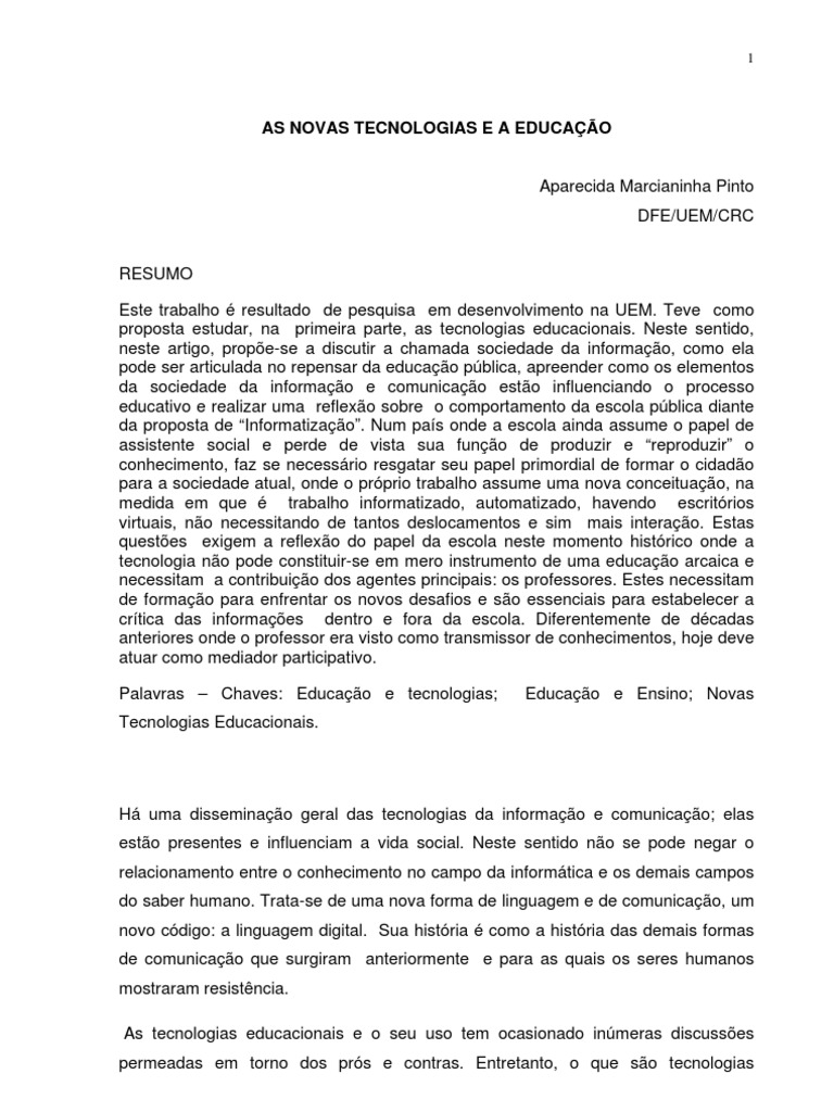 RESUMO Este trabalho resultado de pesquisa em desenvolvimento na UEM. Teve como proposta estudar, na primeira parte, as tecnologias educacionais. Neste sentido, neste artigo, prope-se a discutir a chamada sociedade da informao, como ela pode ser articulada no repensar da educao pblica, apreender como os elementos da sociedade da informao e comunicao esto influenciando o processo educativo e realizar uma reflexo sobre o comportamento da escola pblica diante da proposta de Informatizao. Num pas onde a escola ainda assume o papel de assistente social e perde de vista sua funo de produzir e reproduzir o conhecimento, faz se necessrio resgatar seu papel primordial de formar o cidado para a sociedade atual, onde o prprio trabalho assume uma nova conceituao, na medida em que trabalho informatizado, automatizado, havendo escritrios virtuais, no necessitando de tantos deslocamentos e sim mais interao. Estas questes exigem a reflexo do papel da escola neste momento histrico onde a tecnologia no pode constituir-se em mero instrumento de uma educao arcaica e necessitam a contribuio dos agentes principais: os professores. Estes necessitam de formao para enfrentar os novos desafios e so essenciais para estabelecer a crtica das informaes dentro e fora da escola. Diferentemente de dcadas anteriores onde o professor era visto como transmissor de conhecimentos, hoje deve atuar como mediador participativo. Palavras Chaves: Educao e tecnologias; Tecnologias Educacionais. Educao e Ensino; Novas