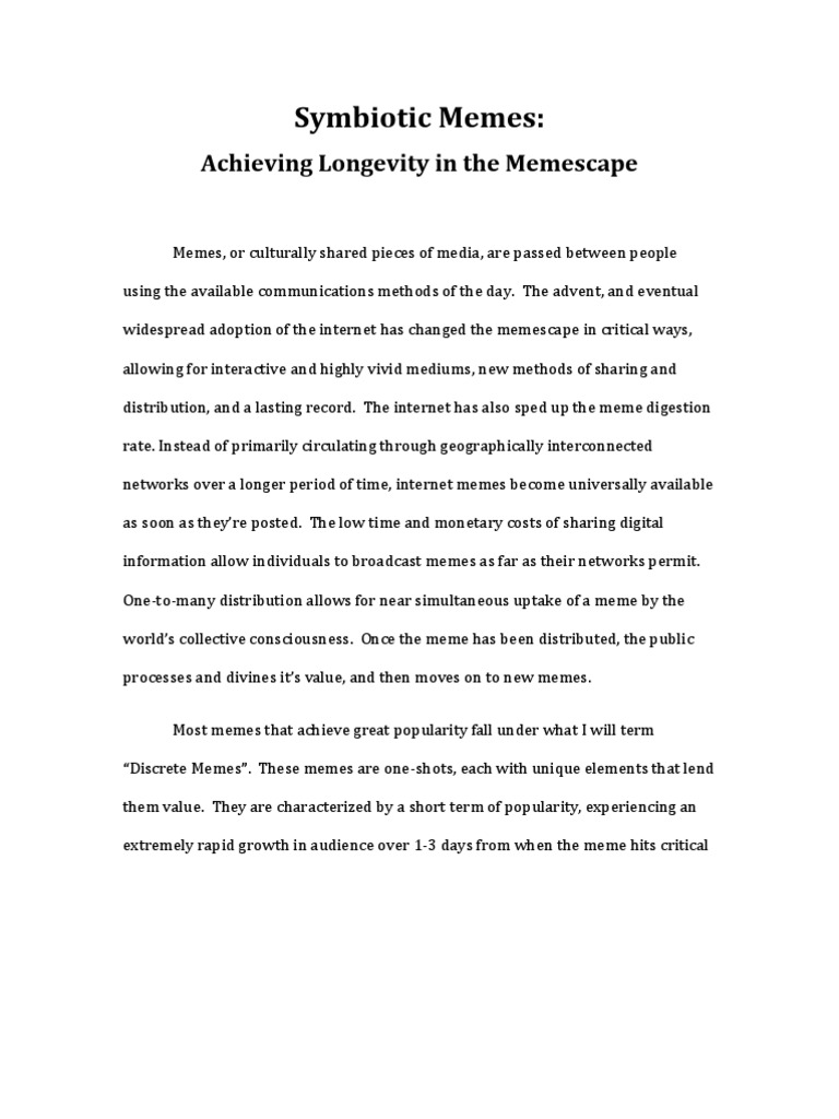 mass1 and then seeing a steep drop in the rate of new audience acquisition over a 45 day period before settling at a fraction of the peak audience. However, another form of meme has developed on the internet with a drastically different adoption model. These memes are comprised of a structure or system of features, and a piece of host content. The features can be applied to different pieces of source content to create-semi unique units of the meme. As both the host content and the form gain audience by being combined, Ive termed these memes Symbiotic Memes. Symbiotic meme units have high fecundity compared to discrete meme units. They contain an equation for value with easily substituted variables, guiding audience members to apply the features of the meme in their own style to a piece of content they have personally selected. These new units are distributed by their creators and help to further spread the original memes underlying equation. The differences in adoption of symbiotic versus discrete memes can be measured using analytics on searches performed on Google, views on Youtube and wall posts on Facebook. Ninja Cat was a discrete meme popularized in September of 2008. It is a video of a cat owner peaking out from around a hallway corner, and each time he peeks out, his cat is sitting still but is a few feet closer to the camera. It does not use the structure or formula of any other meme.