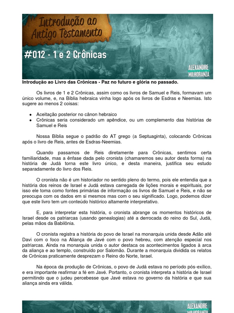 Nossa Bblia segue o padro do AT grego (a Septuaginta), colocando Crnicas aps o livro de Reis, antes de Esdras-Neemias. Quando passamos de Reis diretamente para Crnicas, sentimos certa familiaridade, mas a nfase dada pelo cronista (chamaremos seu autor desta forma) na histria de Jud torna este livro nico, e desta maneira, justifica seu estudo separadamente do livro dos Reis. O cronista no um historiador no sentido pleno do termo, pois ele entendia que a histria dos reinos de Israel e Jud estava carregada de lies morais e espirituais, por isso ele toma como fontes primrias de informao os livros de Samuel e Reis, e no se preocupa com os dados em si mesmos mas com o seu significado. Logo, podemos dizer que este livro tem um contedo histrico altamente interpretativo. E, para interpretar esta histria, o cronista abrange os momentos histricos de Israel desde os patriarcas (usando genealogias) at a derrocada do reino do Sul, Jud, pelas mos da Babilnia. O cronista registra a histria do povo de Israel na monarquia unida desde Ado at Davi com o foco na Aliana de Jav com o povo hebreu, com ateno especial nos patriarcas. Ainda na monarquia unida o autor destaca os acontecimentos ligados arca da aliana e ao templo, construdo por Salomo. Durante a monarquia dividida os relatos de Crnicas praticamente desprezam o Reino do Norte, Israel. Na poca da produo de Crnicas, o povo de Jud estava no perodo ps-exlico, e era importante reafirmar a f em Jav. Portanto, o cronista interpreta a histria de Israel permitindo que o judeu percebesse que Jav estava no governo da histria e que sua aliana ainda era vlida.