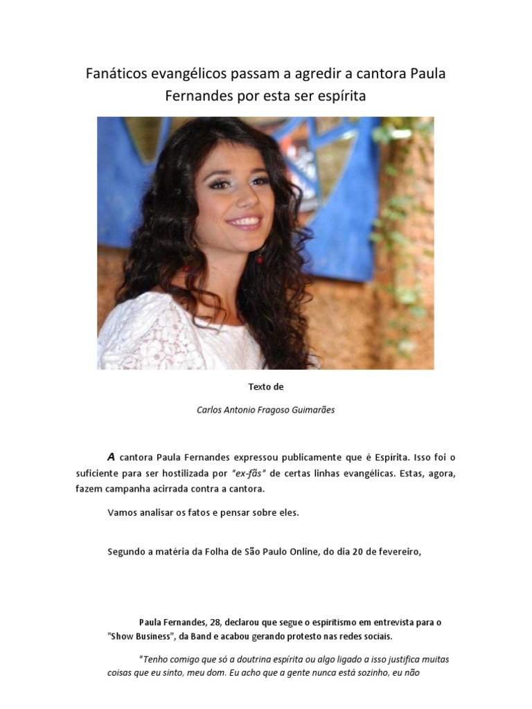 Paula Fernandes, 28, declarou que segue o espiritismo em entrevista para o "Show Business", da Band e acabou gerando protesto nas redes sociais. "Tenho comigo que s a doutrina esprita ou algo ligado a isso justifica muitas coisas que eu sinto, meu dom. Eu acho que a gente nunca est sozinho, eu no