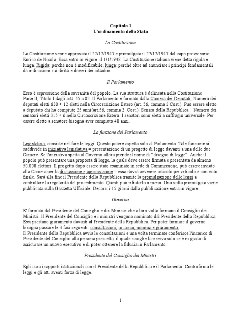de Nicola. Essa entr in vigore il 1/1/1948. La Costituzione italiana viene detta rigida e lunga. Rigida: perch non modificabile; lunga: perch oltre ad enunciare i principi fondamentali d indicazioni sui diritti e doveri dei cittadini. Il Parlamento Esso espressione della sovranit del popolo. La sua struttura delineata nella Costituzione Parte II, Titolo I dagli artt. 55 a 82. Il Parlamento formato dalla Camera dei Deputati: Numero dei deputati eletti 630 + 12 eletti nella Circoscrizione Estero (art. 56, comma 2 Cost.). Pu essere eletto a deputato chi ha compiuto 25 anni(art.56, comma 3 Cost.). Senato della Repubblica : Numero dei senatori eletti 315 + 6 nella Circoscrizione Estero. I senatori sono eletti a suffragio universale. Per essere eletto a senatore bisogna aver compiuto 40 anni. La funzione del Parlamento Legislativa: consiste nel fare le leggi. Questo potere aspetta solo al Parlamento. Tale funzione si suddivide in iniziativa legislativa = presentazione di un progetto di legge davanti a una delle due Camere. Se l'iniziativa spetta al Governo allora prende il nome di disegno di legge. Anche il popolo pu presentare una proposta di legge, la quale deve essere firmata e presentata da almeno 50.000 elettori. Il progetto dopo essere stato esaminato in sede di Commissione, pu essere inviato alla Camera per la discussione e approvazione = essa dovr avvenire articolo per articolo e con voto finale. Sar alla fine il Presidente della Repubblica tramite la promulgazione delle leggi a controllare la regolarit del procedimento. Questi pu rifiutarla o meno. Una volta promulgata viene pubblicata sulla Gazzetta Ufficiale. Decorsi i 15 giorni dalla pubblicazione entra in vigore. Governo E' formato dal Presidente del Consiglio e dai Ministri che a loro volta formano il Consiglio dei Ministri. Il Presidente del Consiglio e i ministri vengono nominato dal Presidente della Repubblica . Essi prestano giuramento davanti al Presidente della Repubblica. Per poter formare il governo bisogna passare le 3 fasi seguenti: consultazioni, incarico, nomina e giuramento. Il Presidente della Repubblica avvia le consultazioni e una volta terminate conferisce l'incarico di Presidente del Consiglio alla persona prescelta, il quale scioglie la riserva solo se in grado di assicurare un nuovo esecutivo e di poter ottenere la fiducia in Parlamento. Presidente del Consiglio dei Ministri Egli cura i rapporti istituzionali con il Presidente della Repubblica e il Parlamento. Controfirma le leggi e gli atti aventi forza di legge.