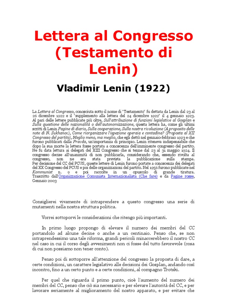 La Lettera al Congresso, conosciuta sotto il nome di "Testamento" fu dettata da Lenin dal 23 al