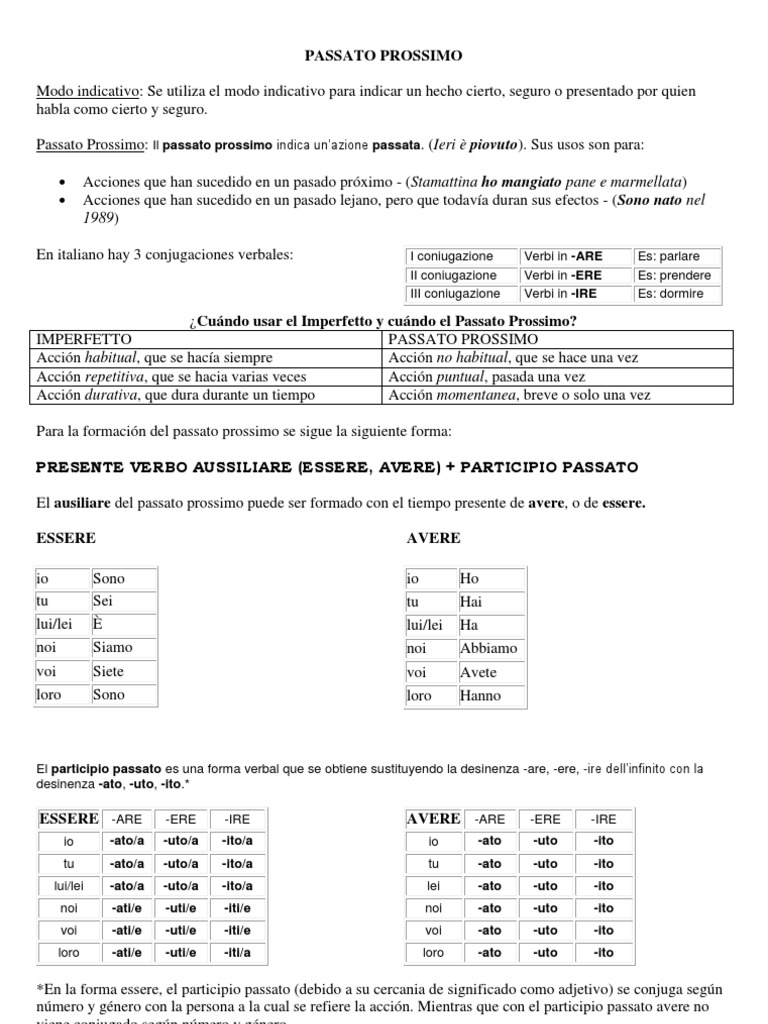 habla como cierto y seguro. Passato Prossimo: Il passato prossimo indica unazione passata. (Ieri piovuto). Sus usos son para: Acciones que han sucedido en un pasado prximo - (Stamattina ho mangiato pane e marmellata) Acciones que han sucedido en un pasado lejano, pero que todava duran sus efectos - (Sono nato nel 1989)