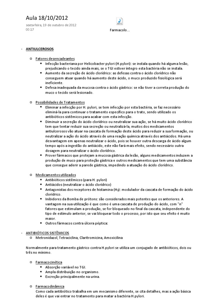 ○ Possibilidades de Tratamentos Eliminar a infecção por H. pylori, se tem infecção por esta bactéria, se faz necessário eliminá-la para continuar o tratamento específico para o trato, sendo utilizado os antibióticos sistêmicos para acabar com esta infecção. Diminuir a secreção do ácido clorídrico ou neutralizar sua ação, se há muito ácido clorídrico tem que tentar reduzir sua secreção ou neutralizá-la, muitos dos medicamentos antiulcerosos vão atuar na cascata de formação deste ácido para reduzir a sua formação, ou neutralizar a ação do ácido através de uma reação química através dos antiácidos. Há uma desvantagem em apenas neutralizar o ácido, pois se houver outra descarga de ácido algum tempo após a ingestão do antiácido, este não fará mais efeito, sendo necessário outra dosagem para neutralizar o ácido clorídrico. Prover fármacos que protejam a mucosa gástrica da lesão, alguns medicamentos induzem a produção de muco para proteção gástrica e outros medicamentos que tem uma substância que consegue aderir a parede gástrica, impedindo a atuação do ácido clorídrico.