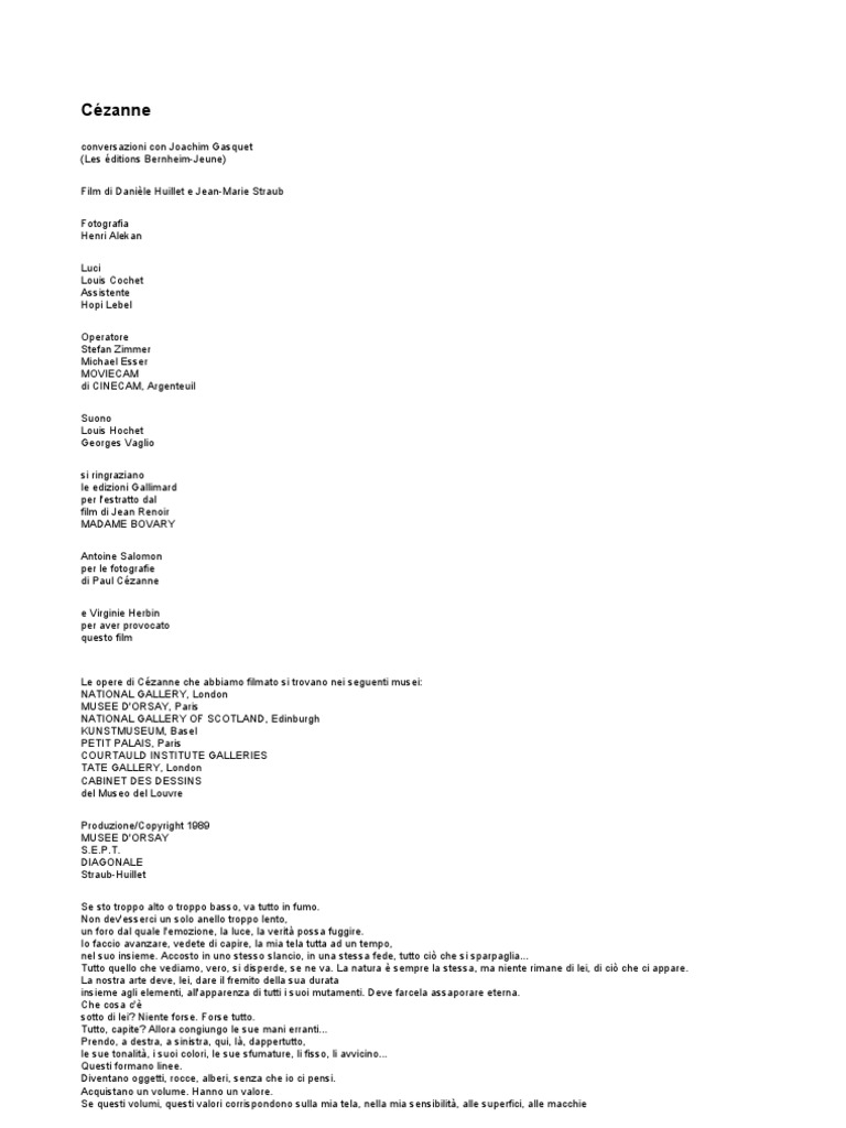 conversazioni con Joachim Gasquet (Les ditions Bernheim-Jeune) Film di Danile Huillet e Jean-Marie Straub Fotografia Henri Alekan Luci Louis Cochet Assistente Hopi Lebel Operatore Stefan Zimmer Michael Esser MOVIECAM di CINECAM, Argenteuil Suono Louis Hochet Georges Vaglio si ringraziano le edizioni Gallimard per l'estratto dal film di Jean Renoir MADAME BOVARY Antoine Salomon per le fotografie di Paul Czanne e Virginie Herbin per aver provocato questo film