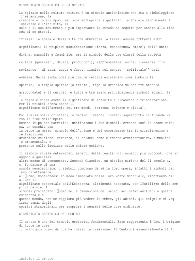 a e lo sviluppo. Nei suoi molteplici significati la spirale rappresenta l 'universo e l'infinito, il sole e il suo movimento e pi importante la strada da seguire per andare alla rice rca di se stessi. Triskel: La spirale della vita che abbraccia la terra. Assume tuttavia altri significati: la triplice manifestazione (forza, conoscenza, amore); dell' unita divina, maschile e femminile; era il simbolo delle tre classi della societ celtica (guerrieri, druidi, produttori); rappresentava, anche, l'energia ''in movimento'' di aria, acqua e fuoco, riunite nel centro ''spirituale'' dell' emblema. Nella simbologia pi comune celtica esistevano come simbolo la spirale, la tripla spirale (o triskel, tipo la svastica ma con tre braccia arrotondate) e il cerchio, e tutti e tre erano principalmente simboli solari. Pe r la spirale c'era anche il significato di infinito e rinascita o reincarnazione. Per il triskel c'era anche il significato dell'armonia dei tre mondi (terreno, celeste e aldil). Poi i missionari cristiani, o meglio i vescovi inviati soprattutto in Irlanda ve rso la fine dell'Impero Romano (tipo san Patrizio), unificarono i due simboli, creando cos la croce celti ca, un cerchio con la croce in mezzo, simbolo dell'unione e del compromesso tra il cristianesimo e le tradizioni druidiche celtiche. Peraltro, il triskel come elemento architettonico, simbolico e ornamentale, presente sulle facciate delle chiese gotiche. Il simbolo rivela determinati aspetti della realt -gli aspetti pi profondi -che sf uggono a qualsiasi altro mezzo di conoscenza. Secondo Giambico, un mistico siriano del II secolo d. c. fondatore di una scuola neoplatonica, i simboli compiono da s la loro opera, infatti i simboli par lano direttamente all uomo, mostrandosi in modo immediato nella loro veste materiale, riportando all a luce il significato essenziale dell Esistenza, altrimenti nascosto, con l utilizzo delle sem plici parole. I simboli proiettano l uomo nella dimensione del sacro. Noi siamo abituati a questa esistenza e a questo mondo, non ne sappiamo pi vedere le ombre, gli abissi, gli enigmi e ci vog liono ormai degli spiriti straordinari per scoprire i segreti delle cose ordinarie. SIGNIFICATO ESOTERICO DEL CENTRO Il centro uno dei simboli esoterici fondamentali. Esso rappresenta l Uno, l origine di tutte le cose, il principio primo da cui ha inizio la creazione. Il Centro essenzialmente il Pr