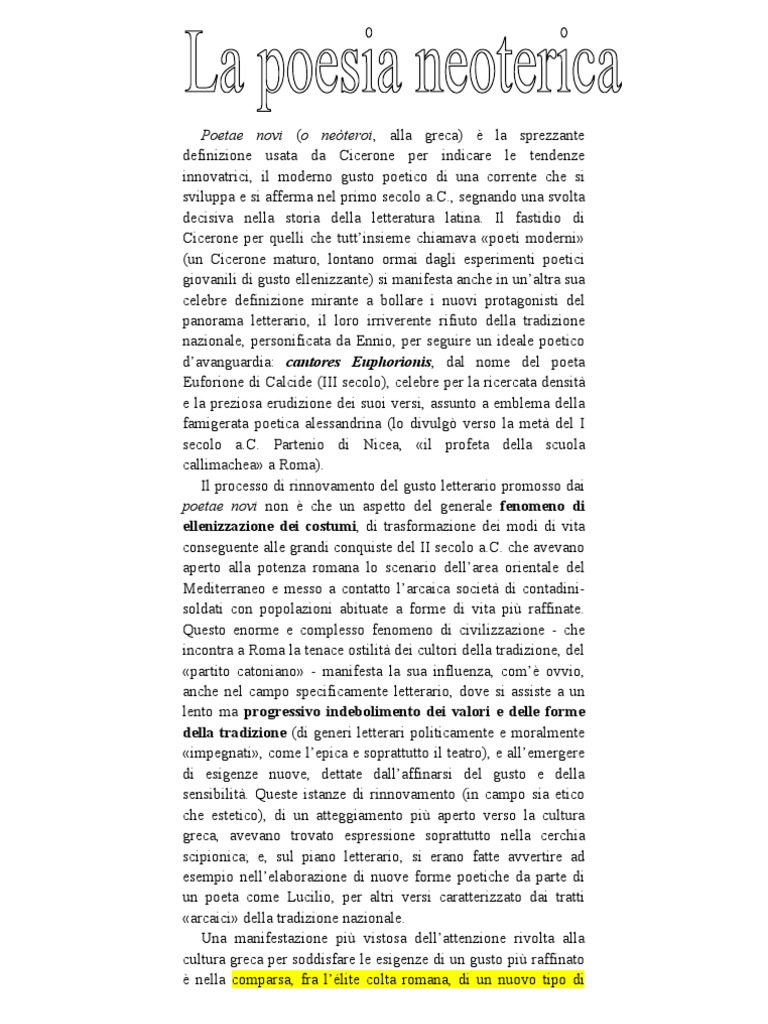 o poetico di una corrente che si sviluppa e si afferma nel primo secolo a.C., segnando una svolta decisiva nella storia della letteratura latina. Il fastidio di Cicerone per quelli che tuttinsieme chiamava poeti moderni (un Cicerone maturo, lontano ormai dagli esperimenti poetici giovanili di gusto ellenizzante) si manifesta anche in unaltra sua celebre definizione mirante a bollare i nuovi protagonisti del panorama letterario, il loro irriverente rifiuto della tradizione nazionale, personificata da Ennio, per seguire un ideale poetico davanguardia: cantores Euphorionis, dal nome del poeta Euforione di Calcide (III secolo), celebre per la ricercata densit e la preziosa erudizione dei suoi versi, assunto a emblema della famigerata poetica alessandrina (lo divulg verso la met del I secolo a.C. Partenio di Nicea, il profeta della scuola callimachea a Roma). Il processo di rinnovamento del gusto letterario promosso dai poetae novi non che un aspetto del generale fenomeno di ellenizzazione dei costumi, di trasformazione dei modi di vita conseguente alle grandi conquiste del II secolo a.C. che avevano aperto alla potenza romana lo scenario dellarea orientale del Mediterraneo e messo a contatto larcaica societ di contadinisoldati con popolazioni abituate a forme di vita pi raffinate. Questo enorme e complesso fenomeno di civilizzazione - che incontra a Roma la tenace ostilit dei cultori della tradizione, del partito catoniano - manifesta la sua influenza, com ovvio, anche nel campo specificamente letterario, dove si assiste a un lento ma progressivo indebolimento dei valori e delle forme della tradizione (di generi letterari politicamente e moralmente impegnati, come lepica e soprattutto il teatro), e allemergere di esigenze nuove, dettate dallaffinarsi del gusto e della sensibilit. Queste istanze di rinnovamento (in campo sia etico che estetico), di un atteggiamento pi aperto verso la cultura greca, avevano trovato espressione soprattutto nella cerchia scipionica; e, sul piano letterario, si erano fatte avvertire ad esempio nellelaborazione di nuove forme poetiche da parte di un poeta come Lucilio, per altri versi caratterizzato dai tratti arcaici della tradizione nazionale. Una manifestazione pi vistosa dellattenzione rivolta alla cultura greca per soddisfare le esigenze di un gusto pi raffinato nella comparsa, fra llite colta romana, di un nuovo tipo di