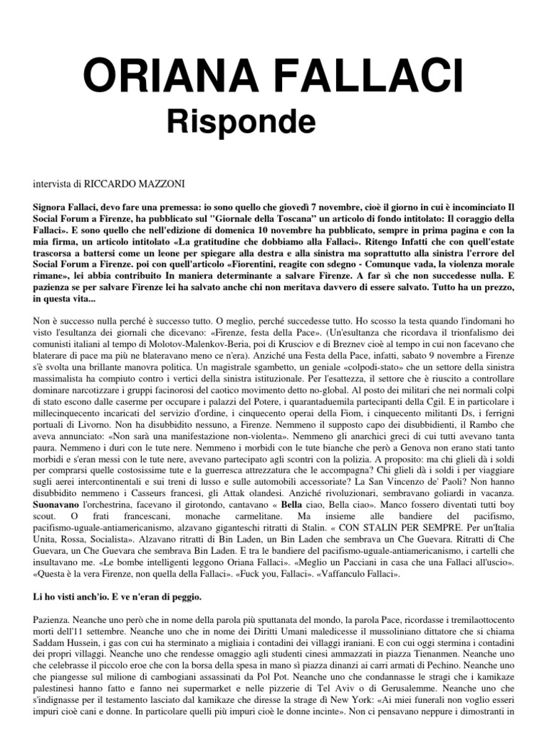 Signora Fallaci, devo fare una premessa: io sono quello che gioved 7 novembre, cio il giorno in cui incominciato Il Social Forum a Firenze, ha pubblicato sul "Giornale della Toscana un articolo di fondo intitolato: Il coraggio della Fallaci. E sono quello che nell'edizione di domenica 10 novembre ha pubblicato, sempre in prima pagina e con la mia firma, un articolo intitolato La gratitudine che dobbiamo alla Fallaci. Ritengo Infatti che con quell'estate trascorsa a battersi come un leone per spiegare alla destra e alla sinistra ma soprattutto alla sinistra l'errore del Social Forum a Firenze. poi con quell'articolo Fiorentini, reagite con sdegno - Comunque vada, la violenza morale rimane, lei abbia contribuito In maniera determinante a salvare Firenze. A far s che non succedesse nulla. E pazienza se per salvare Firenze lei ha salvato anche chi non meritava davvero di essere salvato. Tutto ha un prezzo, in questa vita... Non successo nulla perch successo tutto. O meglio, perch succedesse tutto. Ho scosso la testa quando l'indomani ho visto l'esultanza dei giornali che dicevano: Firenze, festa della Pace. (Un'esultanza che ricordava il trionfalismo dei comunisti italiani al tempo di Molotov-Malenkov-Beria, poi di Krusciov e di Breznev cio al tempo in cui non facevano che blaterare di pace ma pi ne blateravano meno ce n'era). Anzich una Festa della Pace, infatti, sabato 9 novembre a Firenze s' svolta una brillante manovra politica. Un magistrale sgambetto, un geniale colpodi-stato che un settore della sinistra massimalista ha compiuto contro i vertici della sinistra istituzionale. Per l'esattezza, il settore che riuscito a controllare dominare narcotizzare i gruppi facinorosi del caotico movimento detto no-global. Al posto dei militari che nei normali colpi di stato escono dalle caserme per occupare i palazzi del Potere, i quarantaduemila partecipanti della Cgil. E in particolare i millecinquecento incaricati del servizio d'ordine, i cinquecento operai della Fiom, i cinquecento militanti Ds, i ferrigni portuali di Livorno. Non ha disubbidito nessuno, a Firenze. Nemmeno il supposto capo dei disubbidienti, il Rambo che aveva annunciato: Non sar una manifestazione non-violenta. Nemmeno gli anarchici greci di cui tutti avevano tanta paura. Nemmeno i duri con le tute nere. Nemmeno i morbidi con le tute bianche che per a Genova non erano stati tanto morbidi e s'eran messi con le tute nere, avevano partecipato agli scontri con la polizia. A proposito: ma chi glieli d i soldi per comprarsi quelle costosissime tute e la guerresca attrezzatura che le accompagna? Chi glieli d i soldi i per viaggiare sugli aerei intercontinentali e sui treni di lusso e sulle automobili accessoriate? La San Vincenzo de' Paoli? Non hanno disubbidito nemmeno i Casseurs francesi, gli Attak olandesi. Anzich rivoluzionari, sembravano goliardi in vacanza. Suonavano l'orchestrina, facevano il girotondo, cantavano Bella ciao, Bella ciao. Manco fossero diventati tutti boy scout. O frati francescani, monache carmelitane. Ma insieme alle bandiere del pacifismo, pacifismo-uguale-antiamericanismo, alzavano giganteschi ritratti di Stalin. CON STALIN PER SEMPRE. Per un'Italia Unita, Rossa, Socialista. Alzavano ritratti di Bin Laden, un Bin Laden che sembrava un Che Guevara. Ritratti di Che Guevara, un Che Guevara che sembrava Bin Laden. E tra le bandiere del pacifismo-uguale-antiamericanismo, i cartelli che insultavano me. Le bombe intelligenti leggono Oriana Fallaci. Meglio un Pacciani in casa che una Fallaci all'uscio. Questa la vera Firenze, non quella della Fallaci. Fuck you, Fallaci. Vaffanculo Fallaci. Li ho visti anch'io. E ve n'eran di peggio. Pazienza. Neanche uno per che in nome della parola pi sputtanata del mondo, la parola Pace, ricordasse i tremilaottocento morti dell'11 settembre. Neanche uno che in nome dei Diritti Umani maledicesse il mussoliniano dittatore che si chiama Saddam Hussein, i gas con cui ha sterminato a migliaia i contadini dei villaggi iraniani. E con cui oggi stermina i contadini dei propri villaggi. Neanche uno che rendesse omaggio agli studenti cinesi ammazzati in piazza Tienanmen. Neanche uno che celebrasse il piccolo eroe che con la borsa della spesa in mano s piazza dinanzi ai carri armati di Pechino. Neanche uno che piangesse sul milione di cambogiani assassinati da Pol Pot. Neanche uno che condannasse le stragi che i kamikaze palestinesi hanno fatto e fanno nei supermarket e nelle pizzerie di Tel Aviv o di Gerusalemme. Neanche uno che s'indignasse per il testamento lasciato dal kamikaze che diresse la strage d New York: Ai miei funerali non voglio esseri impuri cio cani e donne. In particolare quelli pi impuri cio le donne incinte. Non ci pensavano neppure i dimostranti in