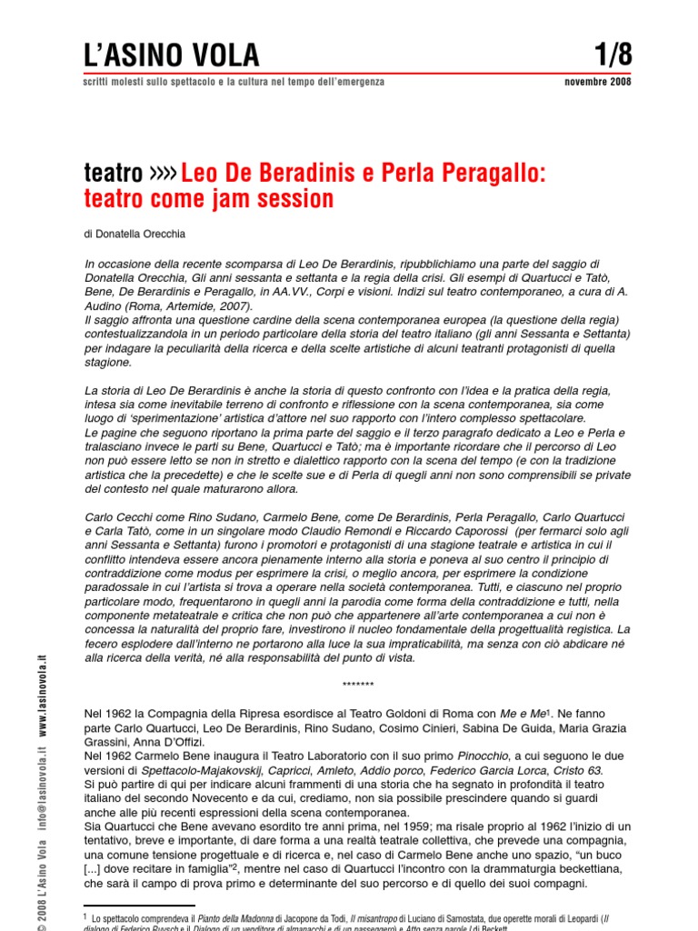 In occasione della recente scomparsa di Leo De Berardinis, ripubblichiamo una parte del saggio di Donatella Orecchia, Gli anni sessanta e settanta e la regia della crisi. Gli esempi di Quartucci e Tat, Bene, De Berardinis e Peragallo, in [Link]., Corpi e visioni. Indizi sul teatro contemporaneo, a cura di A. Audino (Roma, Artemide, 2007). Il saggio affronta una questione cardine della scena contemporanea europea (la questione della regia) contestualizzandola in un periodo particolare della storia del teatro italiano (gli anni Sessanta e Settanta) per indagare la peculiarit della ricerca e della scelte artistiche di alcuni teatranti protagonisti di quella stagione.
