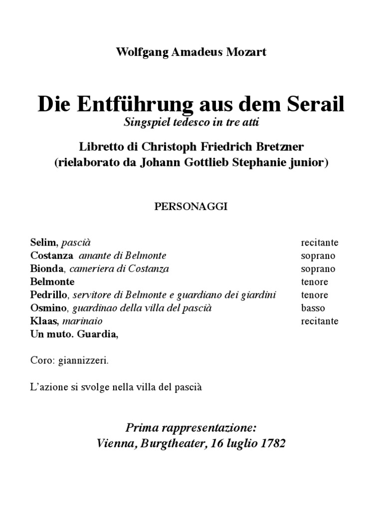 Mozart: Die Entfhrung aus dem Serail - atto primo BELMONTE Ehi, vecchio mio, non mi senti? E` questo il palazzo del Pasci Selim? BELMONTE He, Alter, he! Hrt Ihr nicht? Ist hier des Bassa Selim Palast?