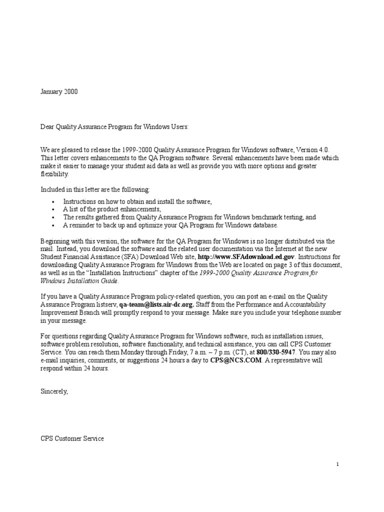 download the Quality Assurance Program for Windows software, call CPS Customer Service to request