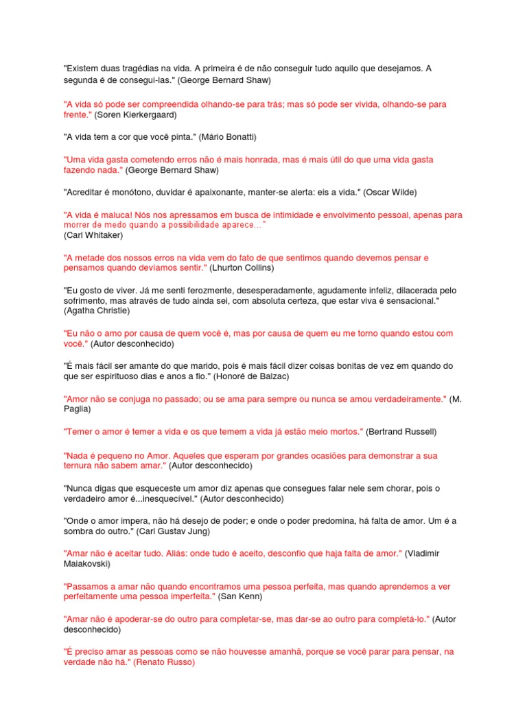 s." (George Bernard Shaw) "A vida s pode ser compreendida olhando-se para trs; mas s pode ser vivida, olhando-se para frente." (Soren Kierkergaard) "A vida tem a cor que voc pinta." (Mrio Bonatti) "Uma vida gasta cometendo erros no mais honrada, mas mais til do que uma vida gasta fazendo nada." (George Bernard Shaw) "Acreditar montono, duvidar apaixonante, manter-se alerta: eis a vida." (Oscar Wilde) "A vida maluca! Ns nos apressamos em busca de intimidade e envolvimento pessoal, apenas para morrer de medo quando a possibilidade aparece" (Carl Whitaker) "A metade dos nossos erros na vida vem do fato de que sentimos quando devemos pensar e pensamos quando devamos sentir." (Lhurton Collins) "Eu gosto de viver. J me senti ferozmente, desesperadamente, agudamente infeliz, dilacerada pelo sofrimento, mas atravs de tudo ainda sei, com absoluta certeza, que estar viva sensacional." (Agatha Christie) "Eu no o amo por causa de quem voc , mas por causa de quem eu me torno quando estou com voc." (Autor desconhecido) " mais fcil ser amante do que marido, pois mais fcil dizer coisas bonitas de vez em quando do que ser espirituoso dias e anos a fio." (Honor de Balzac) "Amor no se conjuga no passado; ou se ama para sempre ou nunca se amou verdadeiramente." (M. Paglia) "Temer o amor temer a vida e os que temem a vida j esto meio mortos." (Bertrand Russell) "Nada pequeno no Amor. Aqueles que esperam por grandes ocasies para demonstrar a sua ternura no sabem amar." (Autor desconhecido) "Nunca digas que esqueceste um amor diz apenas que consegues falar nele sem chorar, pois o verdadeiro amor ...inesquecvel." (Autor desconhecido) "Onde o amor impera, no h desejo de poder; e onde o poder predomina, h falta de amor. Um a sombra do outro." (Carl Gustav Jung) "Amar no aceitar tudo. Alis: onde tudo aceito, desconfio que haja falta de amor." (Vladimir Maiakovski) "Passamos a amar no quando encontramos uma pessoa perfeita, mas quando aprendemos a ver perfeitamente uma pessoa imperfeita." (San Kenn) "Amar no apoderar-se do outro para completar-se, mas dar-se ao outro para complet-lo." (Autor desconhecido) " preciso amar as pessoas como se no houvesse amanh, porque se voc parar para pensar, na verdade no h." (Renato Russo)