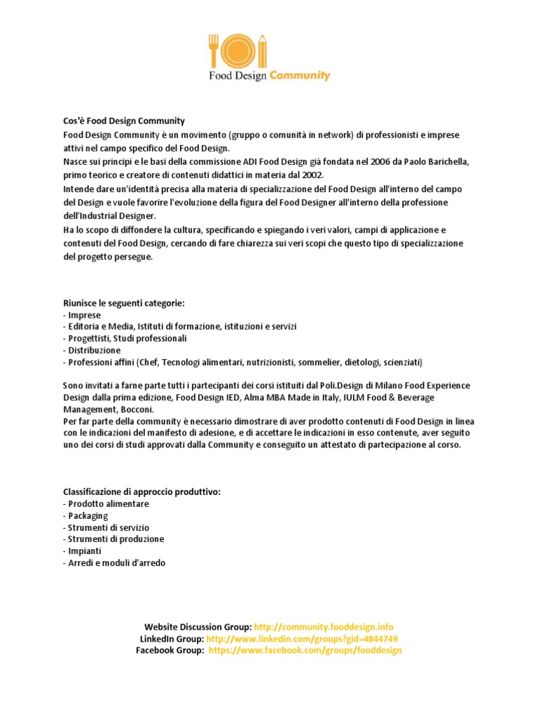 Riunisce le seguenti categorie: - Imprese - Editoria e Media, Istituti di formazione, istituzioni e servizi - Progettisti, Studi professionali - Distribuzione - Professioni affini (Chef, Tecnologi alimentari, nutrizionisti, sommelier, dietologi, scienziati) Sono invitati a farne parte tutti i partecipanti dei corsi istituiti dal [Link] di Milano Food Experience Design dalla prima edizione, Food Design IED, Alma MBA Made in Italy, IULM Food & Beverage Management, Bocconi. Per far parte della community necessario dimostrare di aver prodotto contenuti di Food Design in linea con le indicazioni del manifesto di adesione, e di accettare le indicazioni in esso contenute, aver seguito uno dei corsi di studi approvati dalla Community e conseguito un attestato di partecipazione al corso.