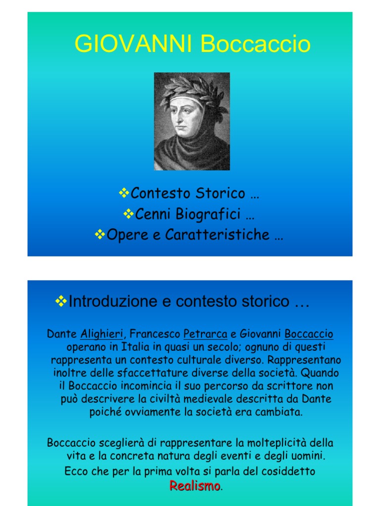 Dante Alighieri, Francesco Petrarca e Giovanni Boccaccio operano in Italia in quasi un secolo; ognuno di questi rappresenta un contesto culturale diverso. Rappresentano inoltre delle sfaccettature diverse della societ. Quando il Boccaccio incomincia il suo percorso da scrittore non pu descrivere la civilt medievale descritta da Dante poich ovviamente la societ era cambiata. Boccaccio sceglier di rappresentare la molteplicit della vita e la concreta natura degli eventi e degli uomini. Ecco che per la prima volta si parla del cosiddetto Realismo.