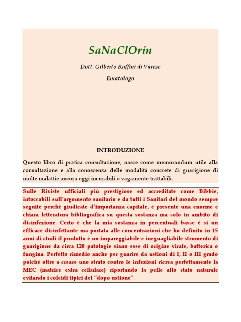 INTRODUZIONE Questo libro di pratica consultazione, nasce come memorandum utile alla consultazione e alla conoscenza delle modalit concrete di guarigione di molte malattie ancora oggi incurabili o vagamente trattabili. Sulle Riviste ufficiali pi prestigiose ed accreditate come Bibbie, intoccabili sullargomento sanitario e da tutti i Sanitari del mondo sempre seguite perch giudicate dimportanza capitale, presente una enorme e chiara letteratura bibliografica su questa sostanza ma solo in ambito di disinfezione. Certo che la mia sostanza in percentuali basse si un efficace disinfettante ma portata alle concentrazioni che ho definito in 15 anni di studi il prodotto un impareggiabile e ineguagliabile strumento di guarigione da circa 120 patologie siano esse di origine virale, batterica o fungina. Perfetto rimedio anche per guarire da ustioni di I, II o III grado poich oltre a creare uno strato contro le infezioni ricrea perfettamente la MEC (matrice extra cellulare) riportando la pelle allo stato naturale evitando i coleidi tipici del dopo ustione.