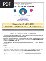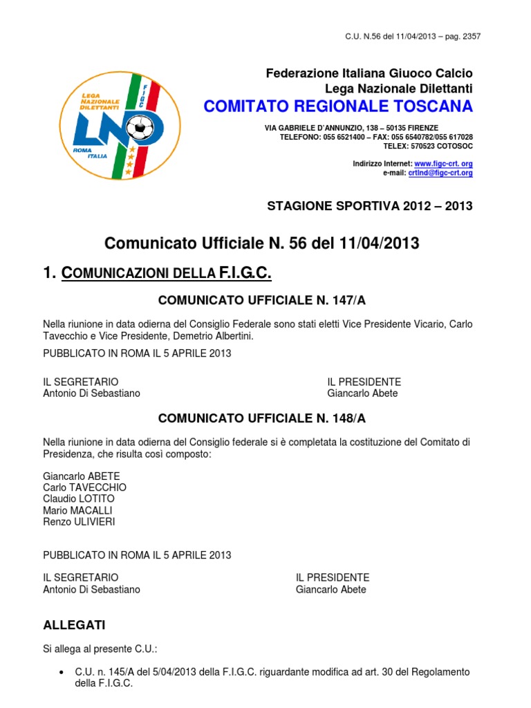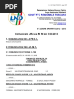 Si allega al presente C.U.: C.U. n. 145/A del 5/04/2013 della F.I.G.C. riguardante modifica ad art. 30 del Regolamento della F.I.G.C. Circolare n. 47 del 10/04/2013 della L.N.D. riguardante copia della nota dellUfficio Coordinamento Attivit Politiche e Istituzionali del C.O.N.I. n. 0000031/13 dell8/04/2013. Modello rendiconto amministrativo per gara di Play-off primo turno Modello rendiconto amministrativo per gara di Play-off secondo turno C.U. n. 70 del 4/04/2013 del Dipartimento Calcio Femminile riguardante domande di ammissione per completamento organici Stagione Sportiva 2013/2014.