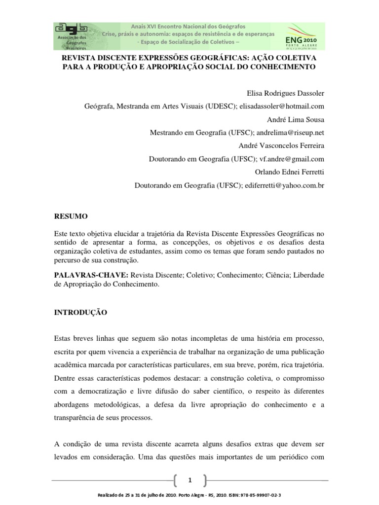 RESUMO Este texto objetiva elucidar a trajetria da Revista Discente Expresses Geogrficas no sentido de apresentar a forma, as concepes, os objetivos e os desafios desta organizao coletiva de estudantes, assim como os temas que foram sendo pautados no percurso de sua construo. PALAVRAS-CHAVE: Revista Discente; Coletivo; Conhecimento; Cincia; Liberdade de Apropriao do Conhecimento.