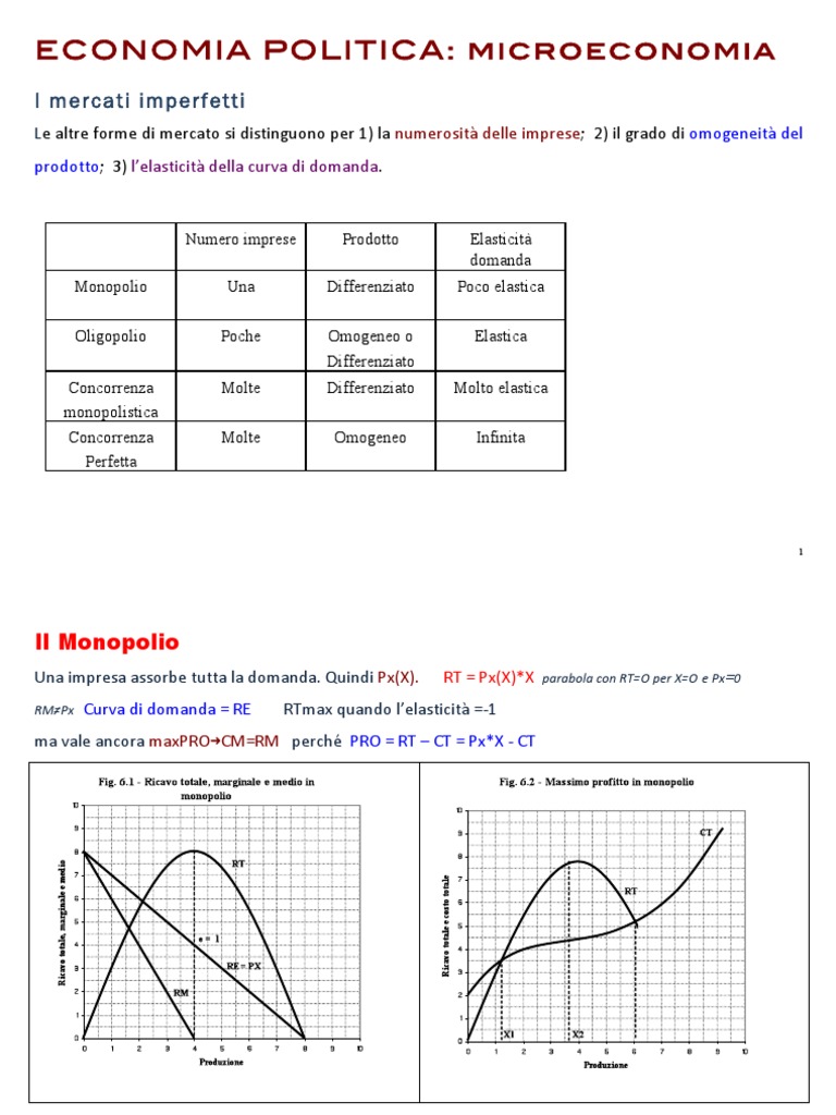 Numero imprese Monopolio Oligopolio Concorrenza monopolistica Concorrenza Perfetta Una Poche Molte Molte Prodotto Differenziato Omogeneo o Differenziato Differenziato Omogeneo Molto elastica Infinita Elasticit domanda Poco elastica Elastica
